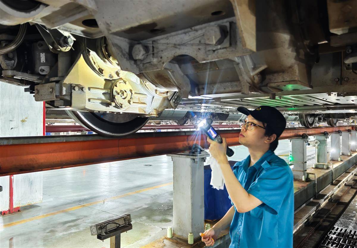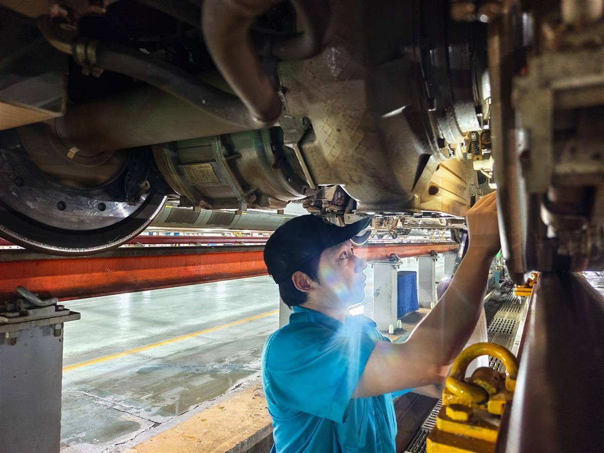 武漢動車段提前部署、精準發力,科學制定專項檢修方案,組織骨干成員對擔當襄荊高鐵運營任務的動車組開展精檢細修。工作中,該段不僅加大對走行部、制動系統等關鍵部件的排查力度,還結合旅客需求開展客服設施設備特色整修,在保障列車安全性能的同時,進一步提升旅客出行體驗,為襄荊高鐵順利開通運營提供堅實保障。(湖北日報全媒記者 柯皓 通訊員 饒宇航 攝)