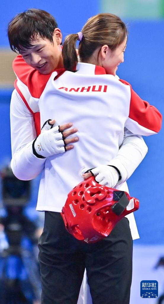 9月27日,安徽隊選手刁李星君(左)和教練在比賽后擁抱慶祝。