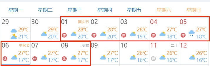 根據(jù)氣象部門信息,雙節(jié)期間我市整體以多云為主,其中10月5日可能有降雨,氣溫保持在17至28℃,天氣較為涼爽,適合出行游玩。