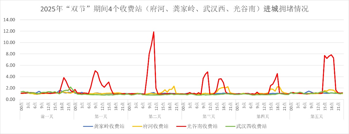 進(jìn)城方向交通壓力較大的為光谷南收費站,預(yù)計放假前一天的18時至21時、假期首日的8時至15時、假期后三天的11時至19時,車流量密集。