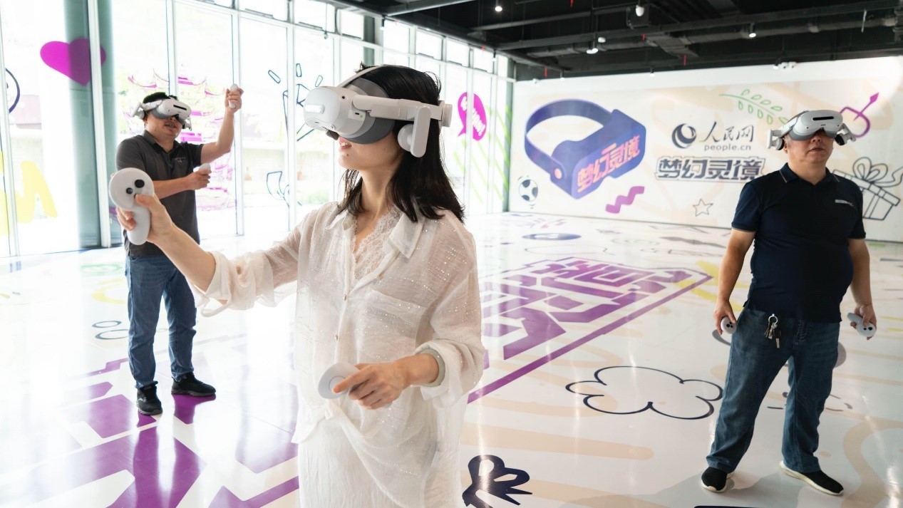 玩家佩戴VR設(shè)備在人民網(wǎng)·夢幻靈境AI+XR大空間中體驗