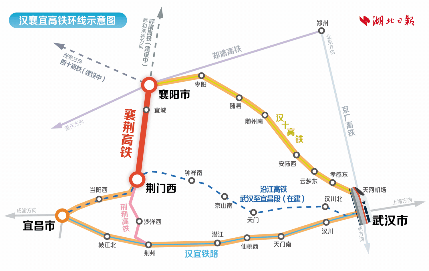 至此,湖北將形成首條高鐵環線。襄荊高鐵、荊荊高鐵、漢宜鐵路荊州至漢口段、漢十高鐵漢口至襄陽東站段,形成一個閉環高鐵環線,串聯武漢市、孝感市、隨州市、襄陽市、荊門市、荊州市、潛江市、仙桃市等9個市,旅行全程約3.5小時。