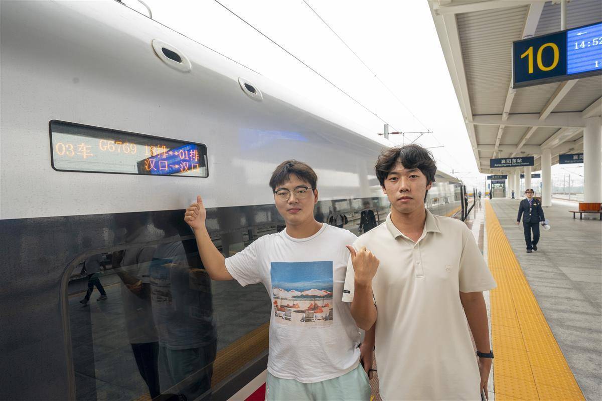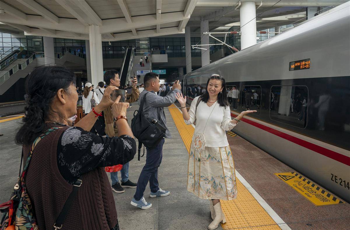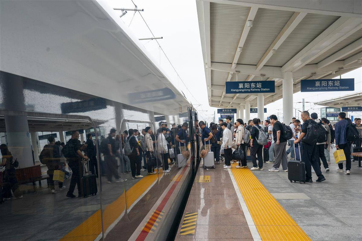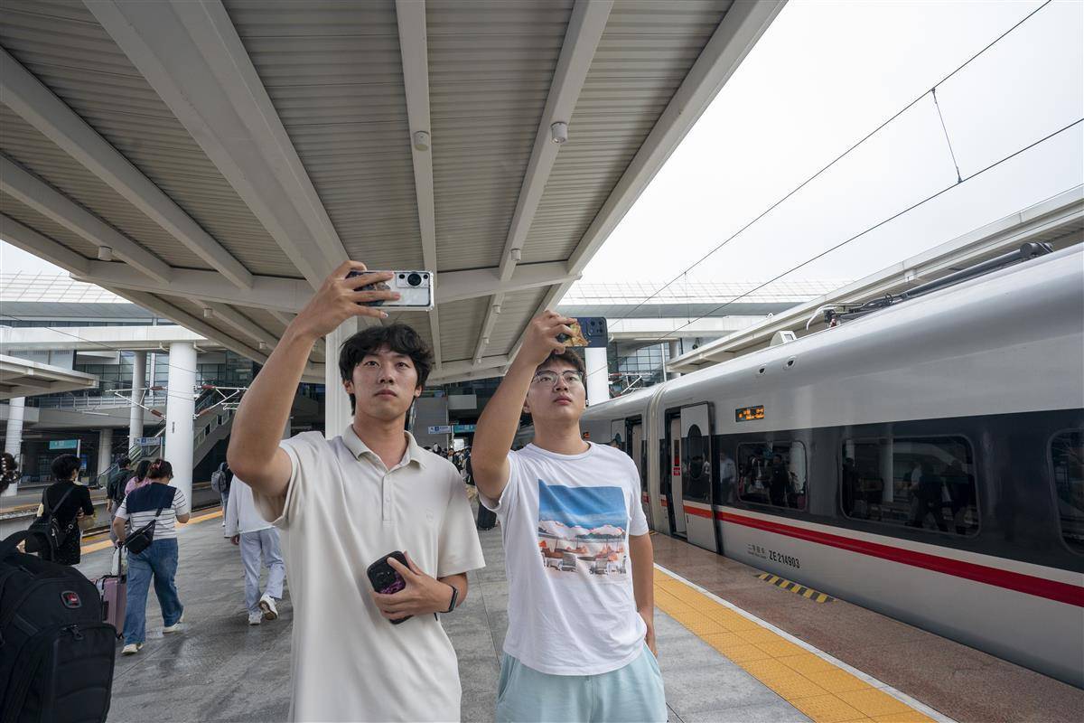 乘坐高鐵環(huán)線的旅客們?cè)谙尻?yáng)東站拍照留念