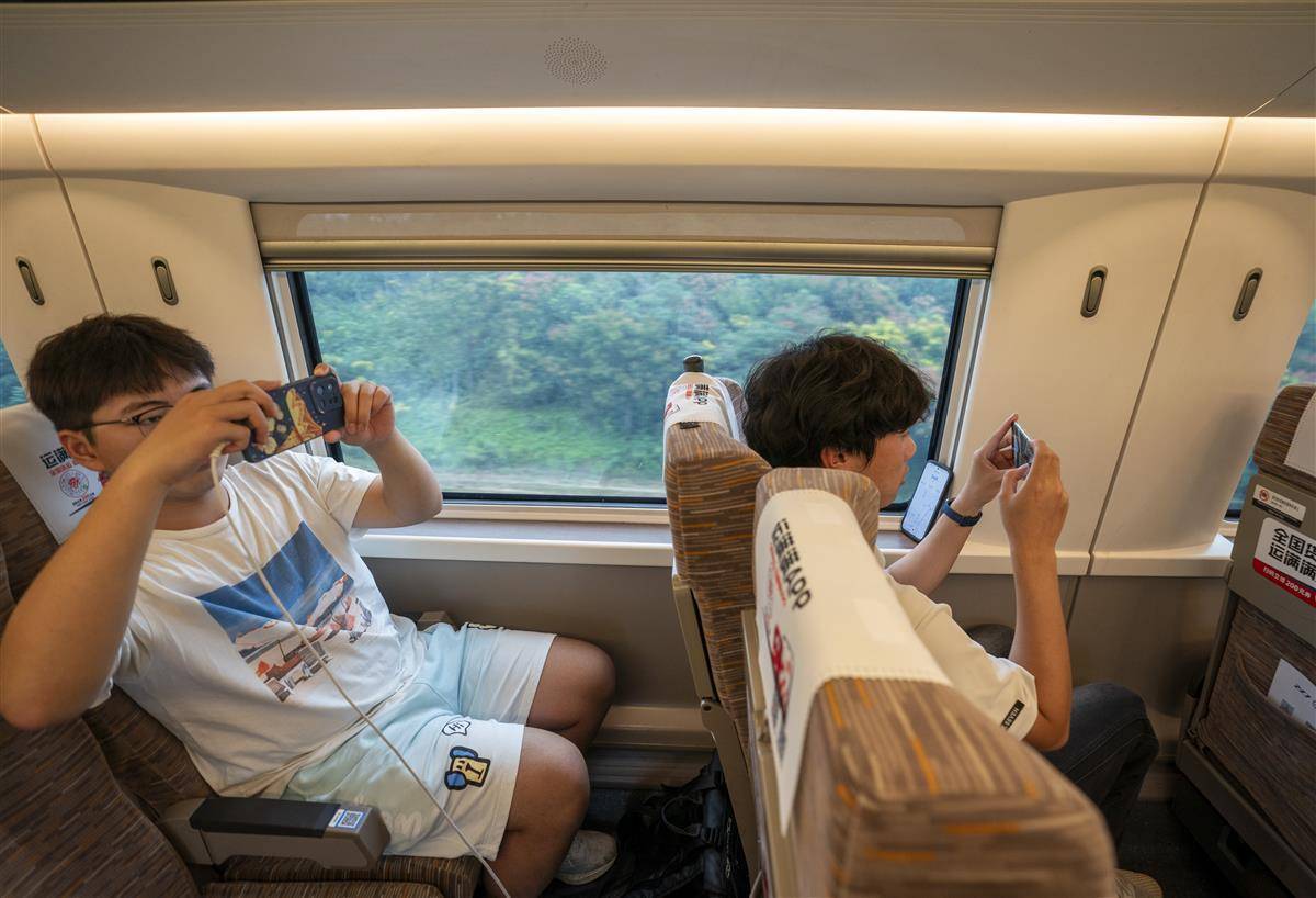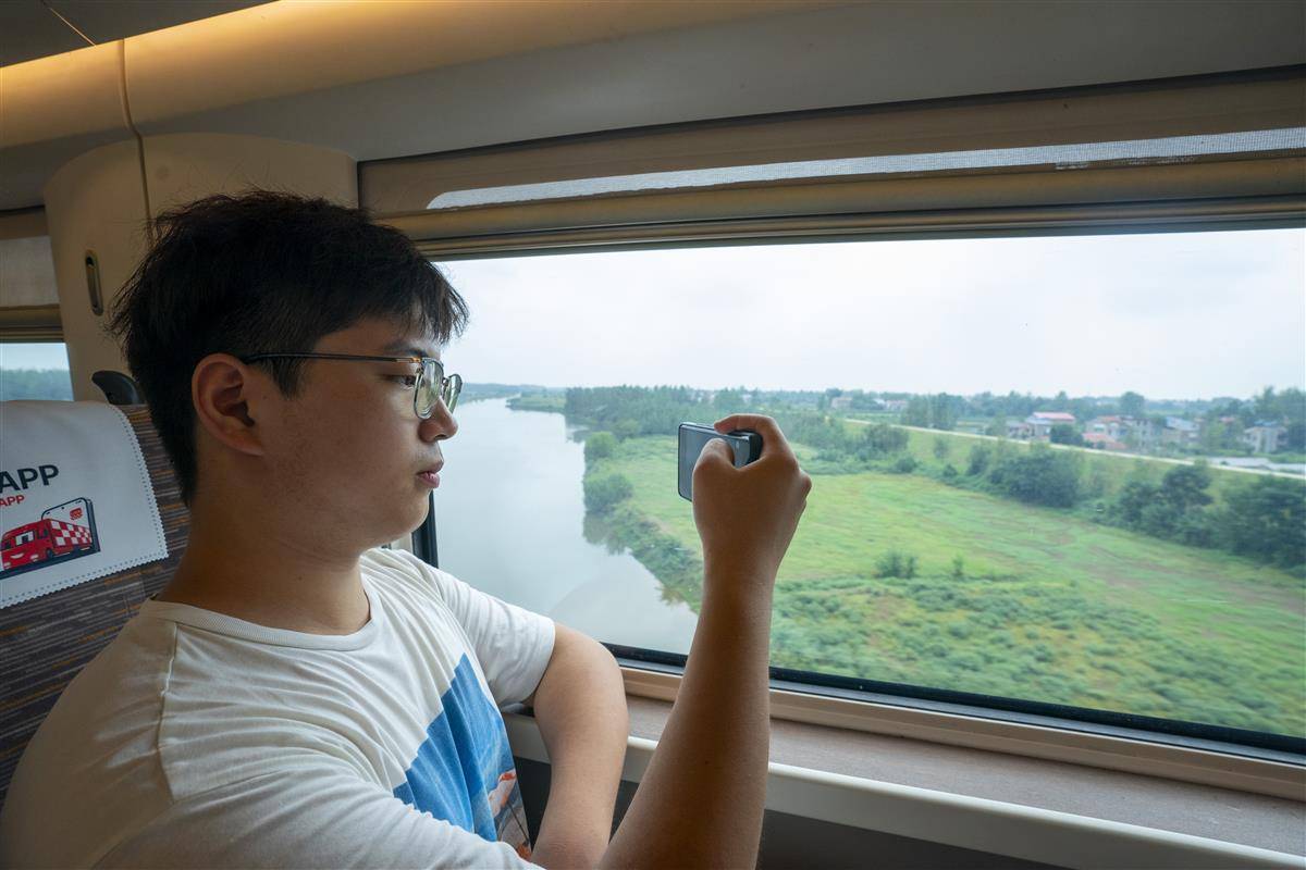 9月28日,飛馳的G6769次高鐵列車上,幾位“鐵路迷”一邊拍攝沿途景色,一邊查看列車運(yùn)行軌跡。當(dāng)日,襄荊高鐵的開(kāi)通運(yùn)營(yíng),標(biāo)志著我省首個(gè)高鐵環(huán)線正式形成。高鐵環(huán)線聯(lián)結(jié)武漢、襄陽(yáng)、荊門(mén)、荊州等8個(gè)市州,極大方便沿線群眾生產(chǎn)生活。襄荊高鐵的開(kāi)通運(yùn)營(yíng),將促進(jìn)漢襄宜“1小時(shí)高鐵圈”加快形成。襄陽(yáng)至荊門(mén)高鐵是國(guó)家“八縱八橫”高速鐵路規(guī)劃網(wǎng)呼南通道的重要組成部分,正線長(zhǎng)度116.23公里,總投資188.32億元,全線設(shè)襄陽(yáng)東站、宜城站、雙河西站、荊門(mén)西站4座車站。開(kāi)通后,與荊荊高鐵、漢宜高鐵、漢十高鐵相銜接,將進(jìn)一步優(yōu)化區(qū)域路網(wǎng)結(jié)構(gòu)和功能,促進(jìn)湖北經(jīng)濟(jì)社會(huì)高質(zhì)量發(fā)展。(湖北日?qǐng)?bào)全媒記者 魏錸 攝)