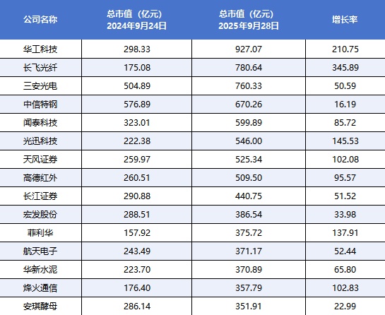與總市值持續上漲、“含科量”更高的A股市場同頻,從去年9月24日到今年9月28日,湖北A股上市公司總市值從約1.13萬億元增長到約1.88萬億元,增長率達65.64%。總市值超百億元的企業數量,從33家增加到48家。市值增長最快的是長飛光纖,增長率為345.89%。