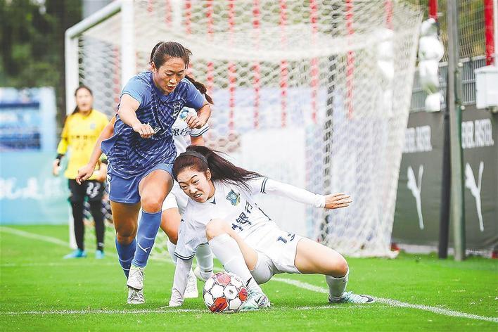 武漢女足球員吳海燕(左)在比賽中奮力拼搶。 (湖北日報全媒記者 時龔 攝)