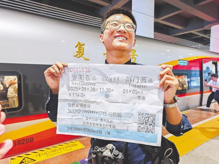 乘坐襄荊高鐵首發列車的旅客展示車票放大票樣。(湖北日報全媒記者 柯皓 攝)