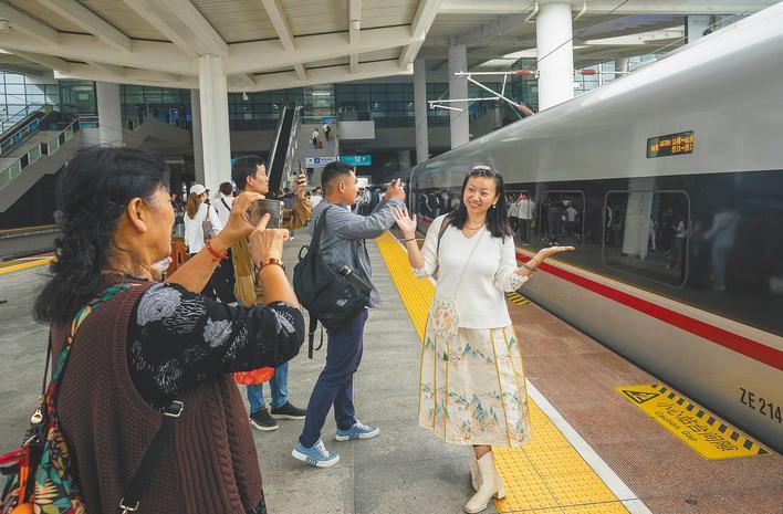 乘客在襄陽東站站臺拍照留念。(湖北日報全媒記者 魏錸 攝)