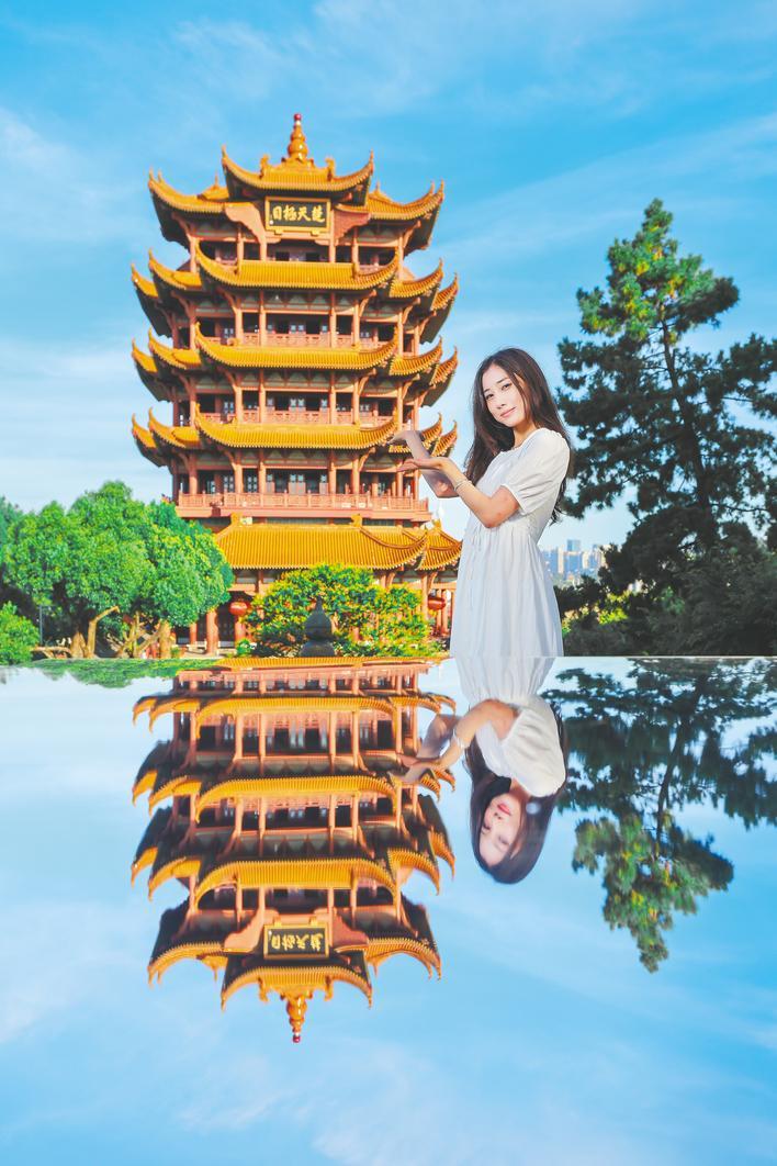 黃鶴樓公園新增“天空之境”,清澈的鏡面完美倒映著千年名樓,游客能拍攝與黃鶴樓同框的倒影照片。 (景區供圖)