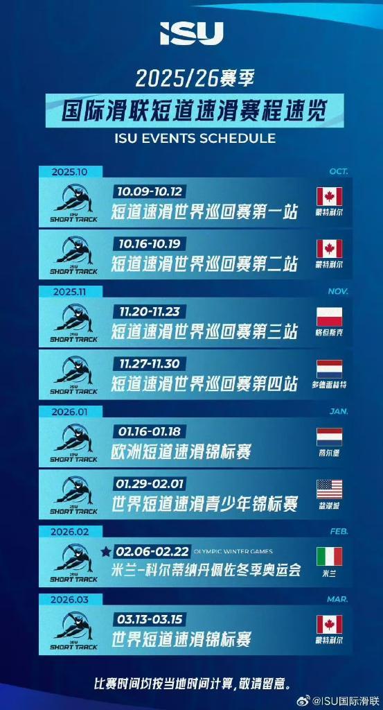 本賽季世巡賽共有四站,前兩站舉辦地都是加拿大蒙特利爾,其中首站將于10月9日開啟,第三和第四站將于11月在波蘭格但斯克、荷蘭多德雷赫特先后舉行;隨后便是2026年2月的米蘭冬奧會;短道速滑世錦賽將于3月在蒙特利爾上演,為賽季收尾。
