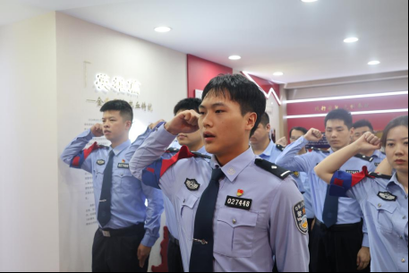 “我是中國人民警察,我宣誓......”面向鮮艷的警旗,全體隊員高舉右拳,重溫入警誓詞。鏗鏘有力的誓言在黨建中心內回蕩,與邱建軍烈士生前的忠誠足跡相互呼應,展現了新一代江漢公安青年沿著英雄之路砥礪前行的堅定決心。