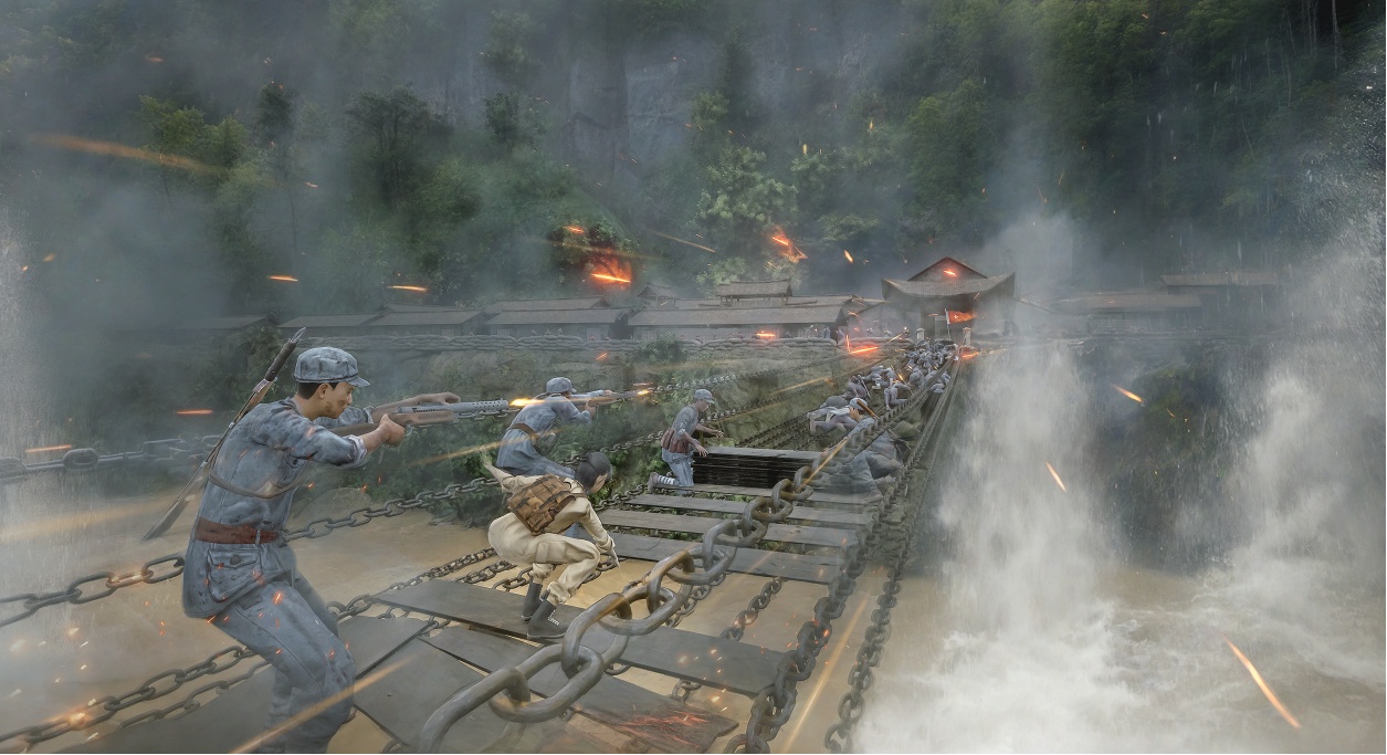 在搶奪瀘定橋的場(chǎng)景中,眼前是鐵索橫江、江水奔騰,游客將手持仿真槍械參與模擬戰(zhàn)斗場(chǎng)景,在槍林彈雨中與身旁的“戰(zhàn)友們”奮勇向前打擊敵人;在遵義會(huì)議的場(chǎng)景中,游客仿佛一步跨入了1935年那間肅穆的會(huì)議室,走近每一位正在激烈討論的歷史人物身旁,觀察他們眉宇間的沉思、焦慮與堅(jiān)定。
