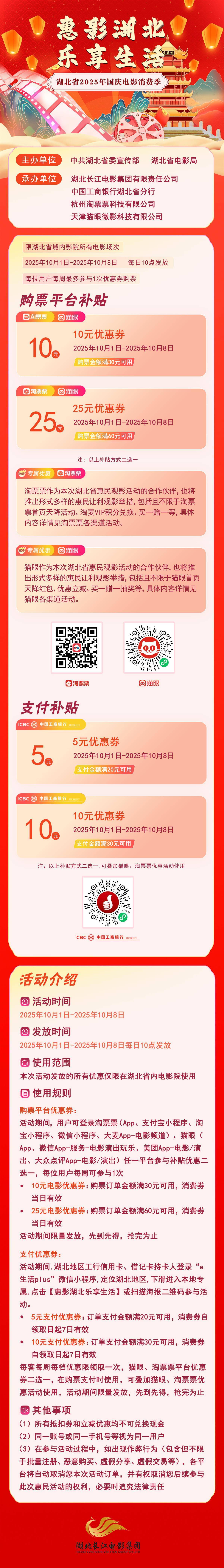 消費券領取后,用戶需在當日完成兌換,可用于兌換國慶檔內任意場次電影票。同時,淘票票和貓眼還同步推出“天降紅包”“積分兌換”“買一贈一”等形式多樣的優惠觀影舉措。此外,湖北地區工行用戶還有機會領取“滿20元減5元”或“滿30元減10元”的支付優惠券(發放時間為每周四至周日上午10點),可與貓眼、淘票票等優惠活動疊加使用。