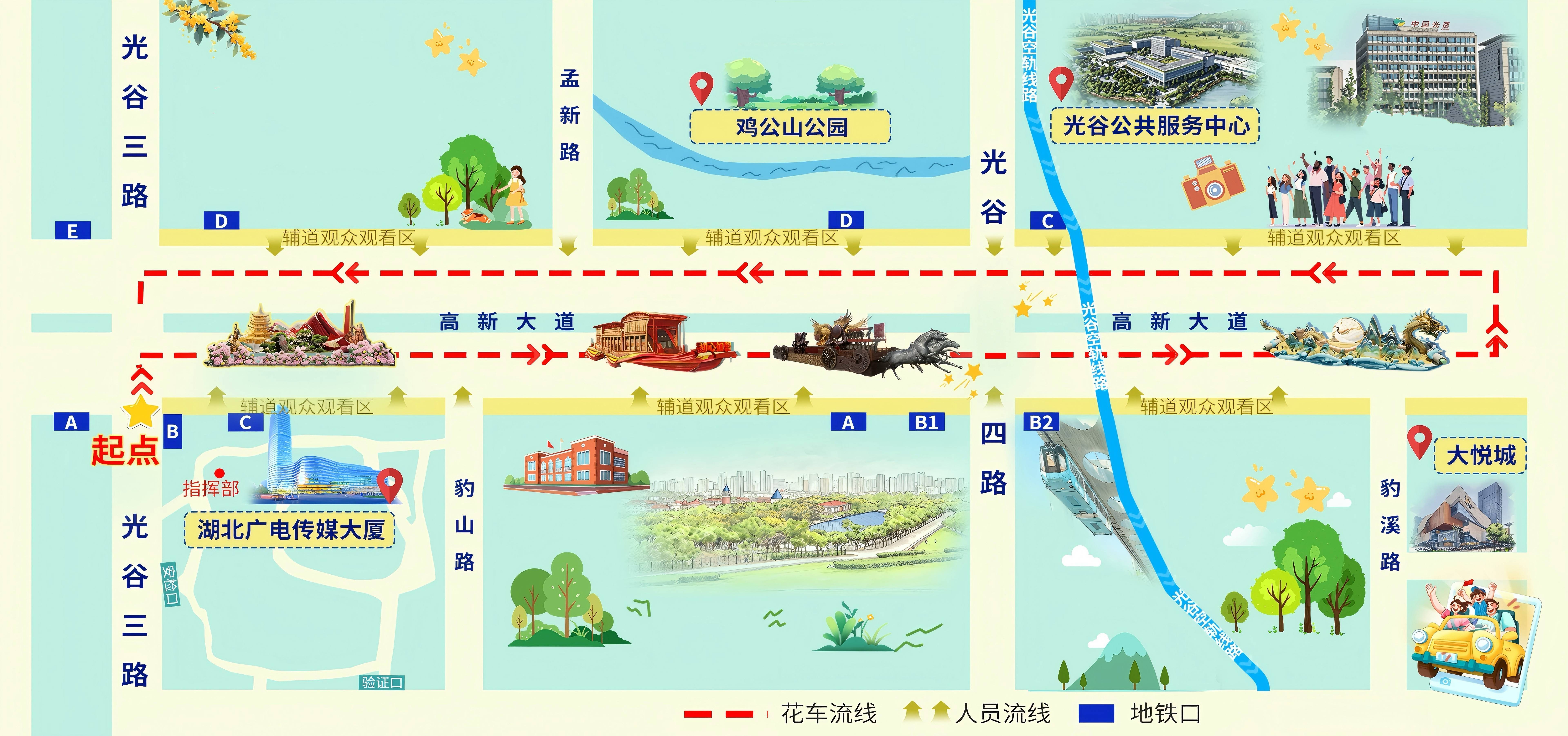 巡游線路兩側將分為6個觀演方陣區域,觀眾無需預約即可前往。其中從高新大道(光谷三路至武漢大悅城)沿線觀賞區視野開闊,巡游隊伍經過時均可清晰觀賞,無需擁擠。特別提醒觀眾,選定觀演方陣區域后有序進入,觀賞中不要追逐或隨著花車行進自由走動。