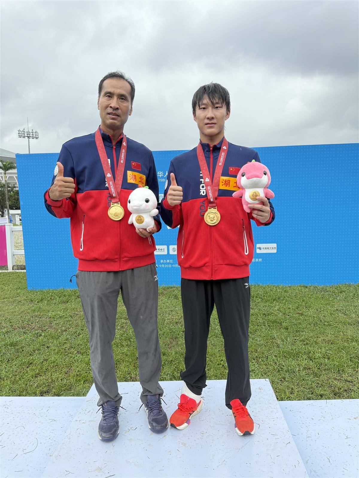 陳柏良和教練張光濤(左)登上冠軍領獎臺。(湖北日報通訊員 熊漢 攝)