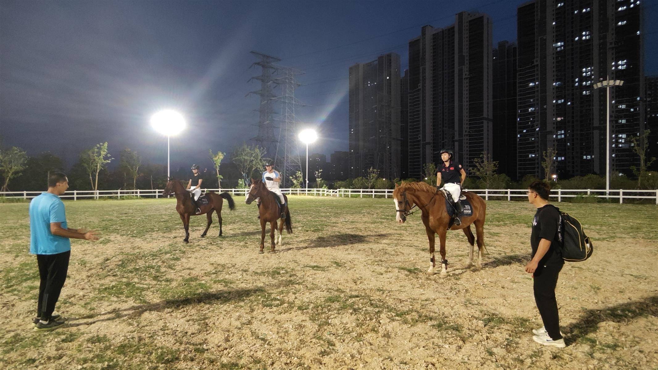 決賽前,張光濤帶領陳柏良、湯奧斯、涂雨欣夜練馬術。(湖北日報通訊員 熊漢攝)