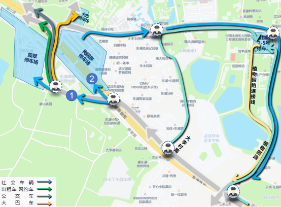 車多時(shí),直接去植物園2-5號(hào)停車場(chǎng)、①號(hào)攬翠停車場(chǎng)(磨山櫻花停車場(chǎng))最穩(wěn)妥。請(qǐng)注意!攬翠路可能會(huì)臨時(shí)管制,聽交警叔叔指揮就好!