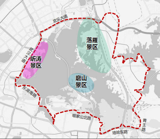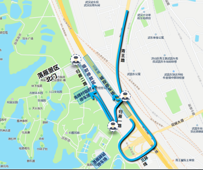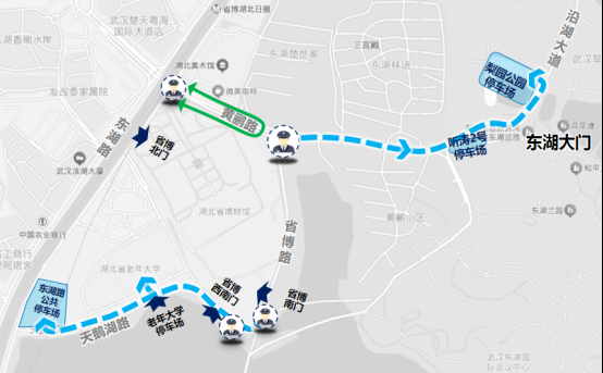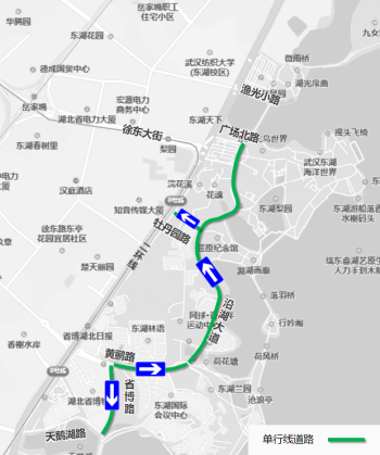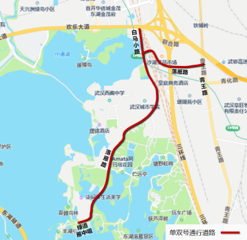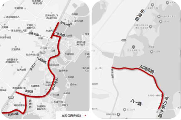 二環(huán)線梨園下穿通道地面層(徐東大街至漁光小路)、沿湖大道(黃鸝路至廣場(chǎng)北路)、廣場(chǎng)北路、黃鸝路(東湖路至東湖大門)、省博路(黃鸝路至天鵝湖路)、天鵝湖路(東湖路至省博路)、東湖南路(洪山路至卓刀泉北路)、卓刀泉北路(東湖南路至八一路路口)。