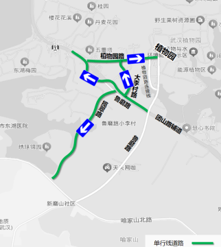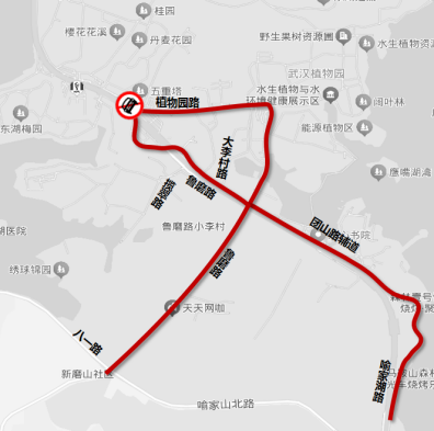 魯磨路(八一路至櫻花園大門)、植物園路(魯磨路至團(tuán)山路)、團(tuán)山路輔道(喻家湖路至團(tuán)山路)。