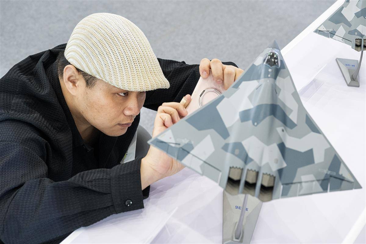 9月29日,一名軍迷在6代機(jī)模型前拍照。(湖北日?qǐng)?bào)全媒記者 任勇 攝)