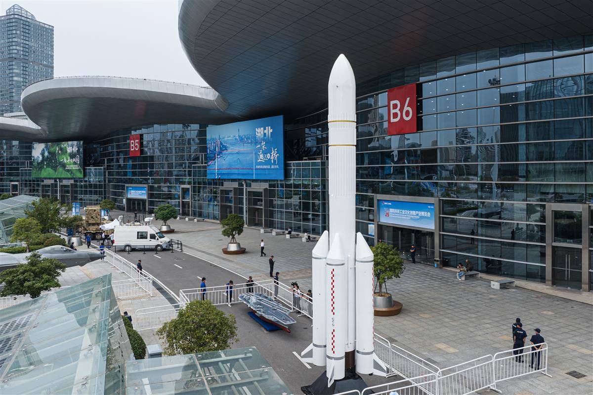 9月29日,長(zhǎng)征五號(hào)火箭模型亮相武漢。(湖北日?qǐng)?bào)全媒記者 任勇 攝)