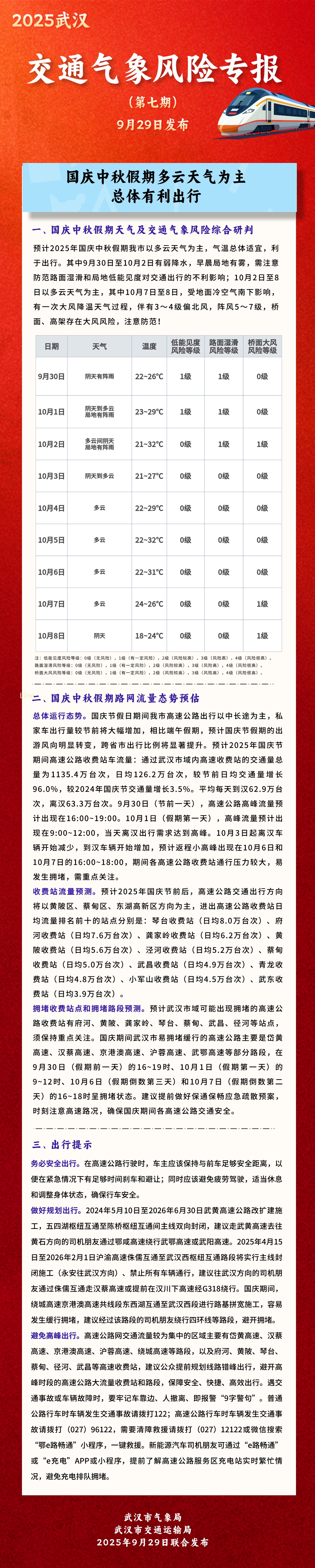 湖北日報訊(記者湯煒瑋、通訊員陳聲超)9月29日,武漢市氣象局、武漢市交通運輸局聯合發布《交通氣象風險專報》。專報顯示:國慶中秋假期武漢市以多云天氣為主,總體有利出行。