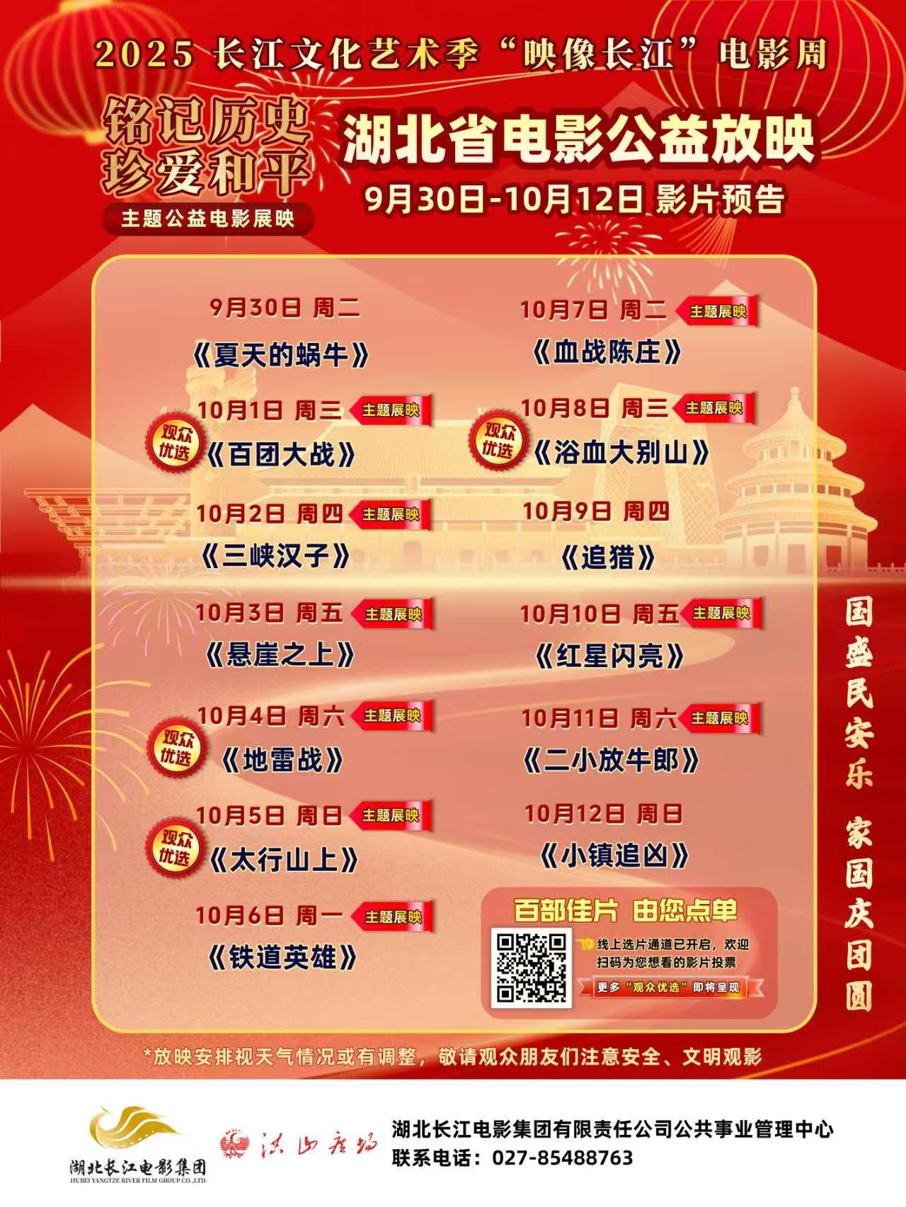 為了紀(jì)念中國人民抗日戰(zhàn)爭暨世界反法西斯戰(zhàn)爭勝利80周年,洪山廣場還將舉辦“銘記歷史,珍愛和平”主題公益電影展映活動。活動將于每晚7點,在洪山廣場林蔭休閑廣場播放一部愛國主義影片(影片以當(dāng)天播放為準(zhǔn),遇惡劣天氣停播順延),影片包括《百團大戰(zhàn)》《三峽漢子》《懸崖之上》《地雷戰(zhàn)》《太行山上》《鐵道英雄》《血戰(zhàn)陳莊》《浴血大別山》等。該活動由湖北長江電影集團和武昌區(qū)城管執(zhí)法局洪山廣場管理處共同主辦。