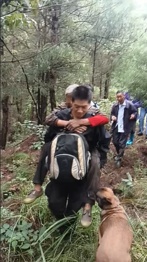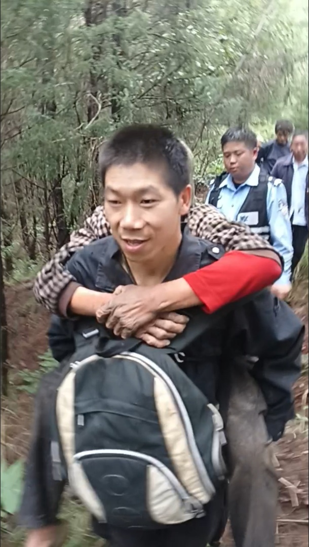 開辟出僅容一人通過(guò)的通道后,趙宗波與同行家屬緩緩下行,終于在刺叢深處找到了蜷縮的張某。確認(rèn)老人意識(shí)清醒、精神狀態(tài)良好后,趙宗波小心將老人背起,一手環(huán)住老人雙腿穩(wěn)固身體,一手緊抓救援繩緩慢向上攀爬;家屬在后方托舉老人背部輔助發(fā)力,“追風(fēng)”則沿著通道外側(cè)隨行。經(jīng)過(guò)20余分鐘協(xié)作,3人成功抵達(dá)山頂安全區(qū)域。