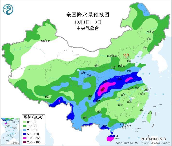 全國來看,中央氣象臺預計,國慶中秋假日期間(10月1日至8日),華西至黃淮多降雨,青藏高原及新疆北部多雨雪;冷空氣活動頻繁,有3股冷空氣影響我國;5日至6日將有臺風影響華南沿海;黃淮東部部分時段有大霧。