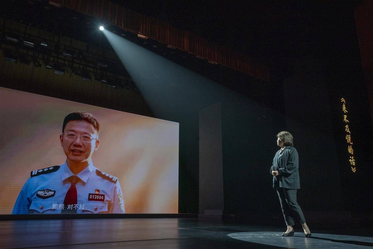 報告會現場,萬松的妻子張熙與AI技術還原的丈夫隔空相望。