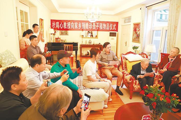 杜鳴心教授(右二)將其畢生創作的樂譜手稿,捐贈給家鄉潛江。 (湖北日報通訊員 譚欣 攝)