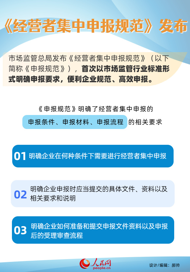 人民網北京9月30日電 (記者郝帥)記者從國家市場監管總局獲悉,《經營者集中申報規范》(以下簡稱《申報規范》)于日前正式發布,將于10月1日起施行。本次發布的《申報規范》首次以市場監管行業標準形式明確申報要求,便利企業規范、高效申報。