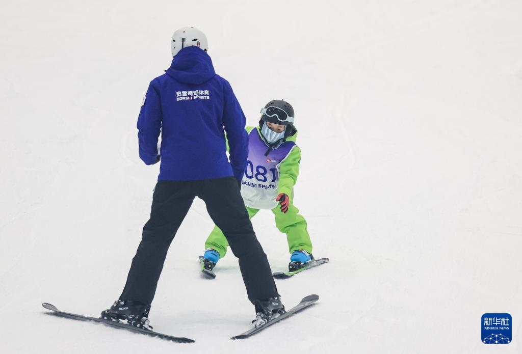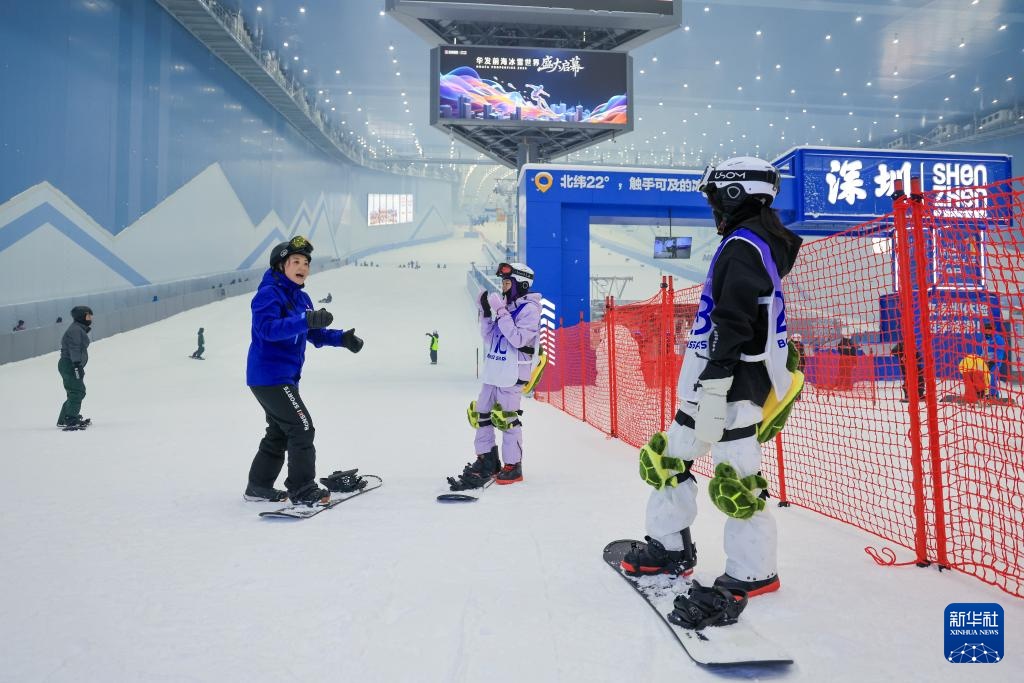 9月29日,在深圳·前海冰雪世界,教練(左)指導學員學習單板。