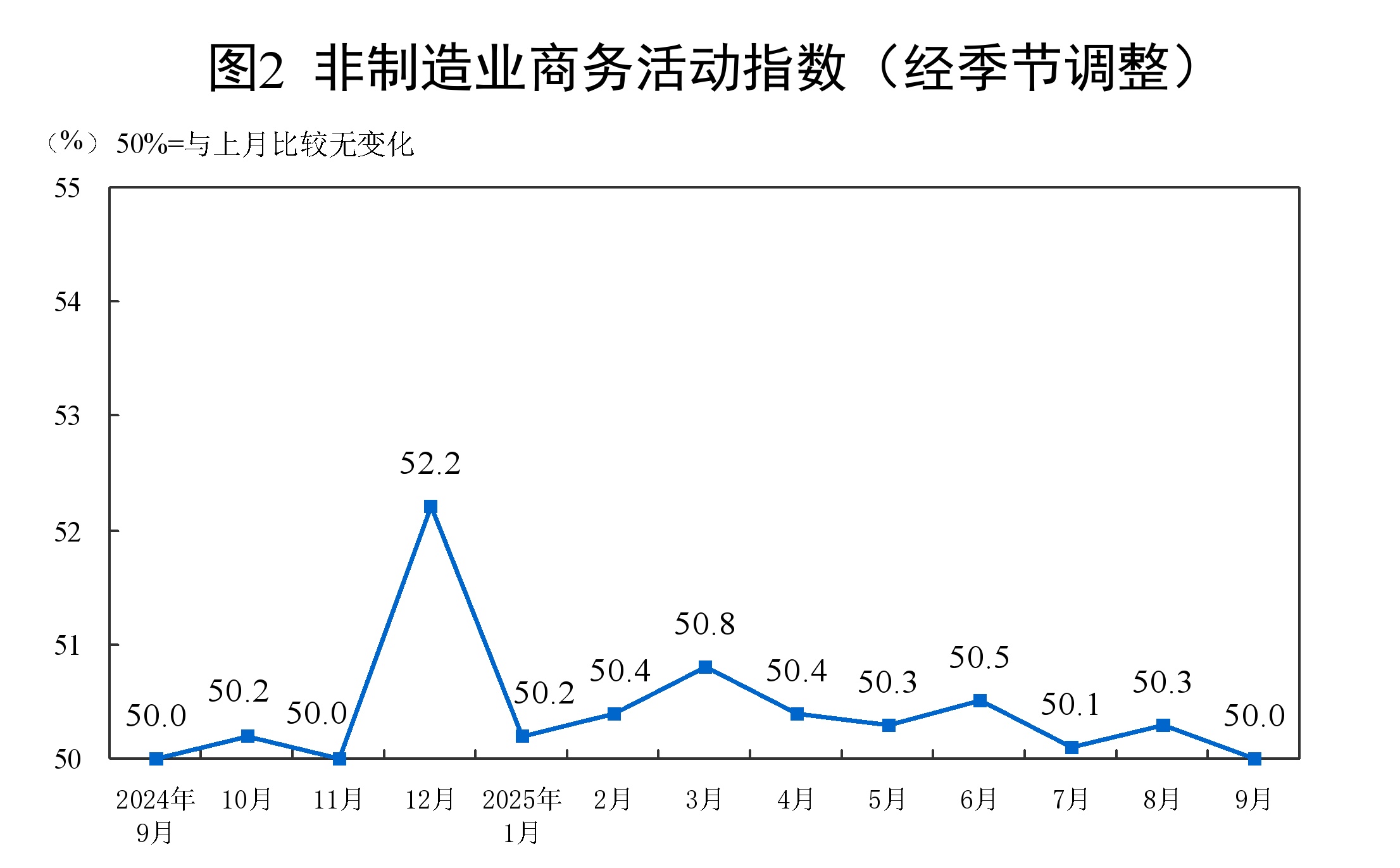 9月份,非制造業商務活動指數為50.0%,比上月下降0.3個百分點,位于臨界點,非制造業業務總量總體穩定。