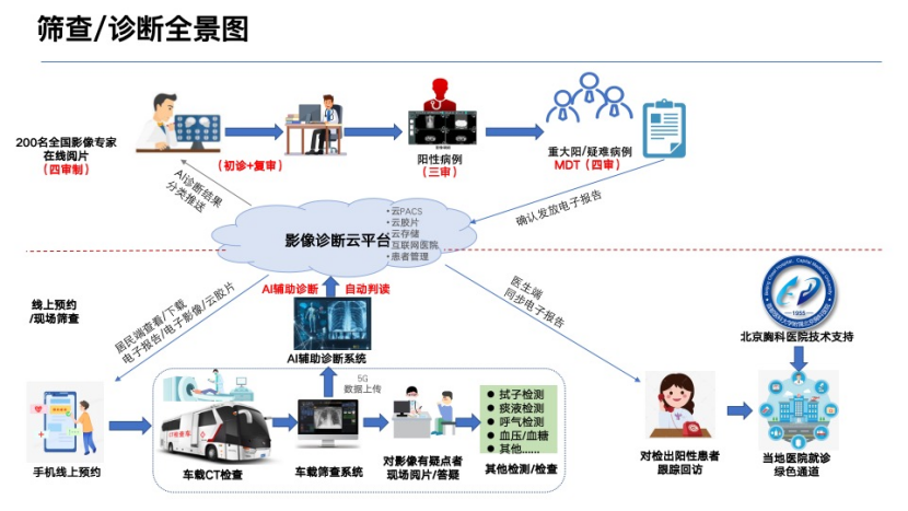 居民在完成車載CT檢查后,其健康數據便進入一個高效、周到的服務閉環。7日后,居民即可通過手機端便捷查收這份經過“四審制”嚴格把關的電子報告。對于篩查出的陽性病例,系統還配套安排了跟蹤回訪以及當地醫院的綠色通道,并享有北京胸科醫院的遠程技術支持,形成了“篩查-診斷-報告-隨訪-診療”的無縫銜接,真正實現了對居民健康的全程化管理。
