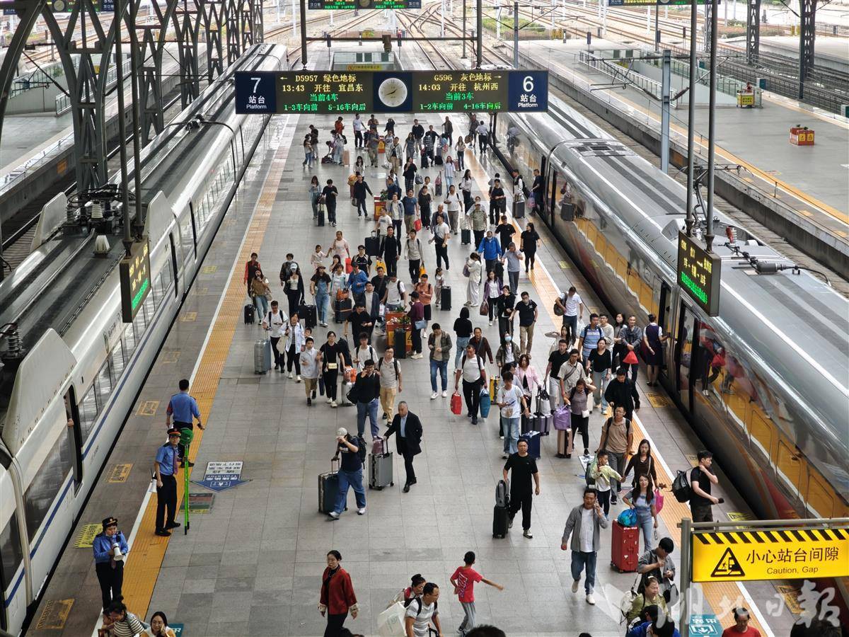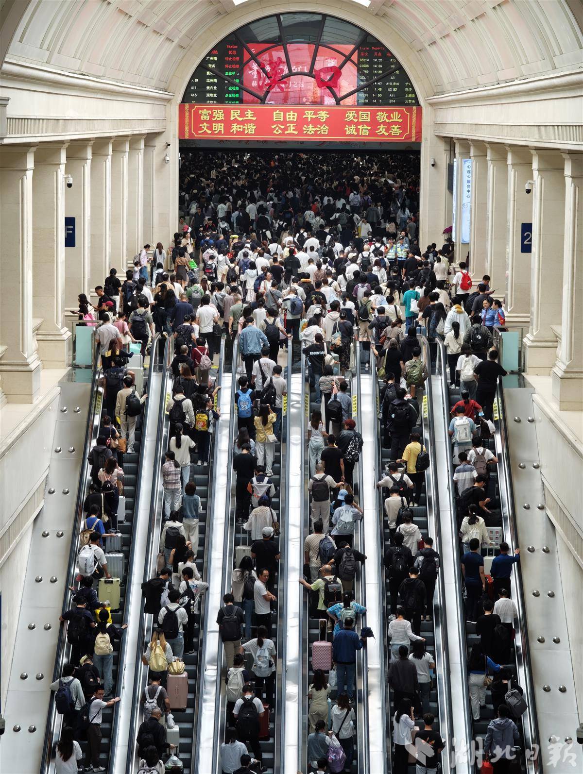 湖北日報訊(記者胡祎、通訊員邱晟)9月30日14時30分,漢口火車站到達客流和出發客流同步迎來高峰。候車大廳高峰小時發送旅客突破2萬余人次。