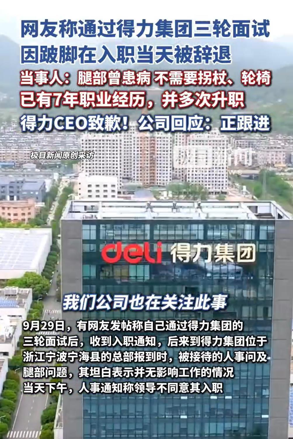 9月29日,有網友在社交網站發帖稱,自己通過得力集團三輪面試后,在入職報到當天因為走路跛腳問題被辭退。隨后得力集團CEO陳雪強留言進行致歉,表示將妥善處理此事。