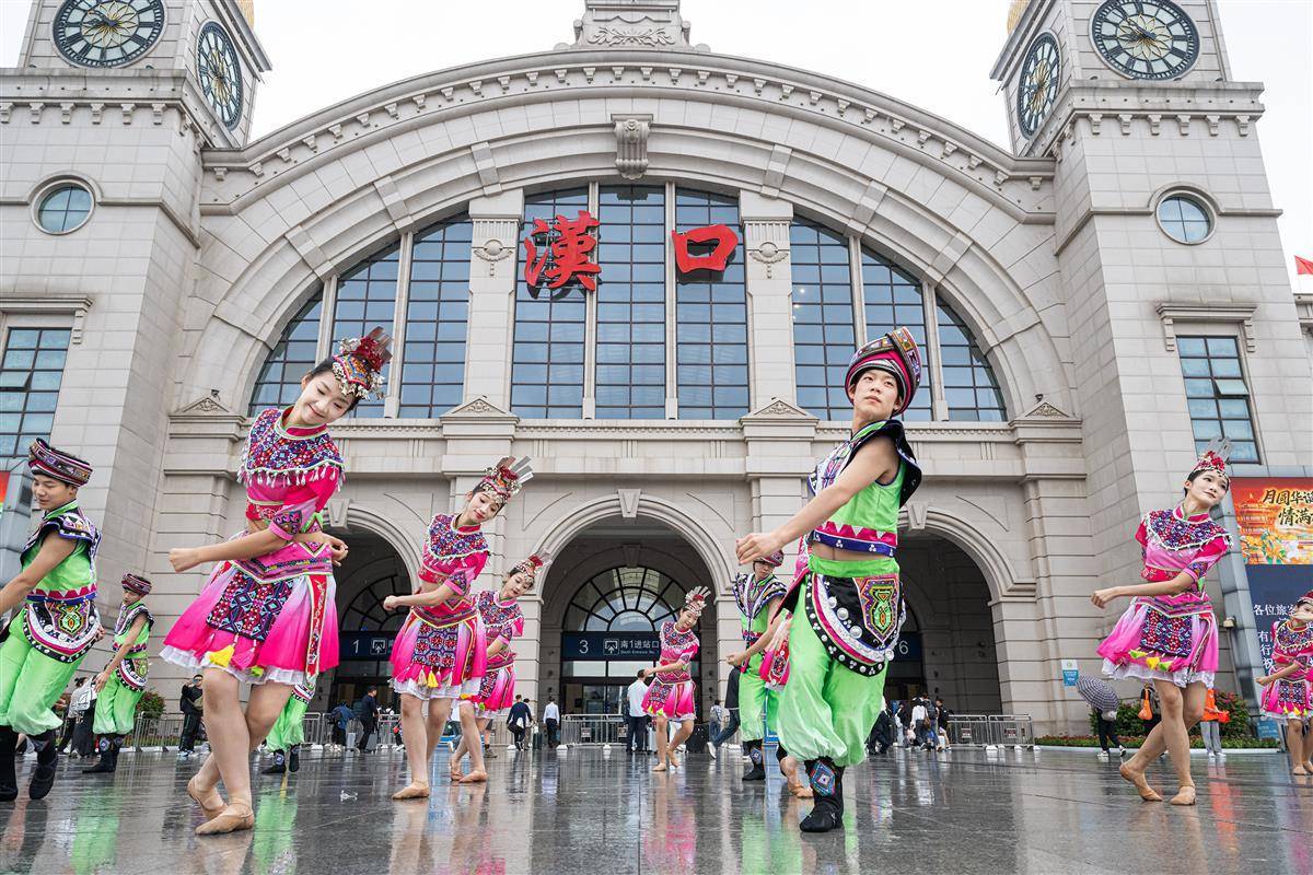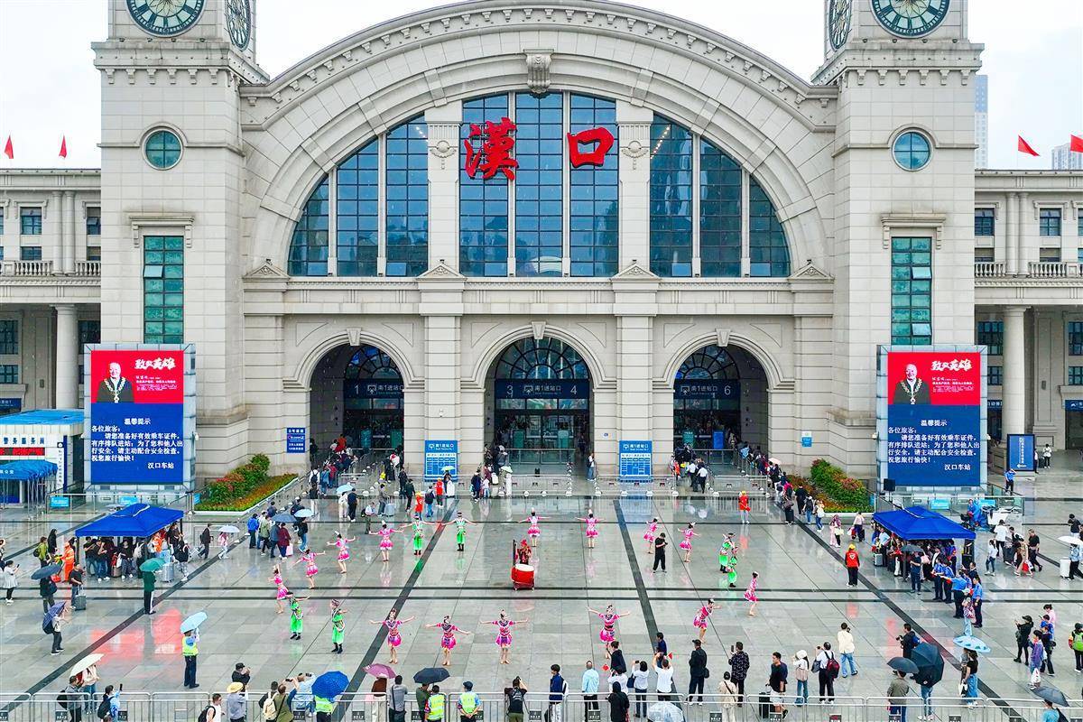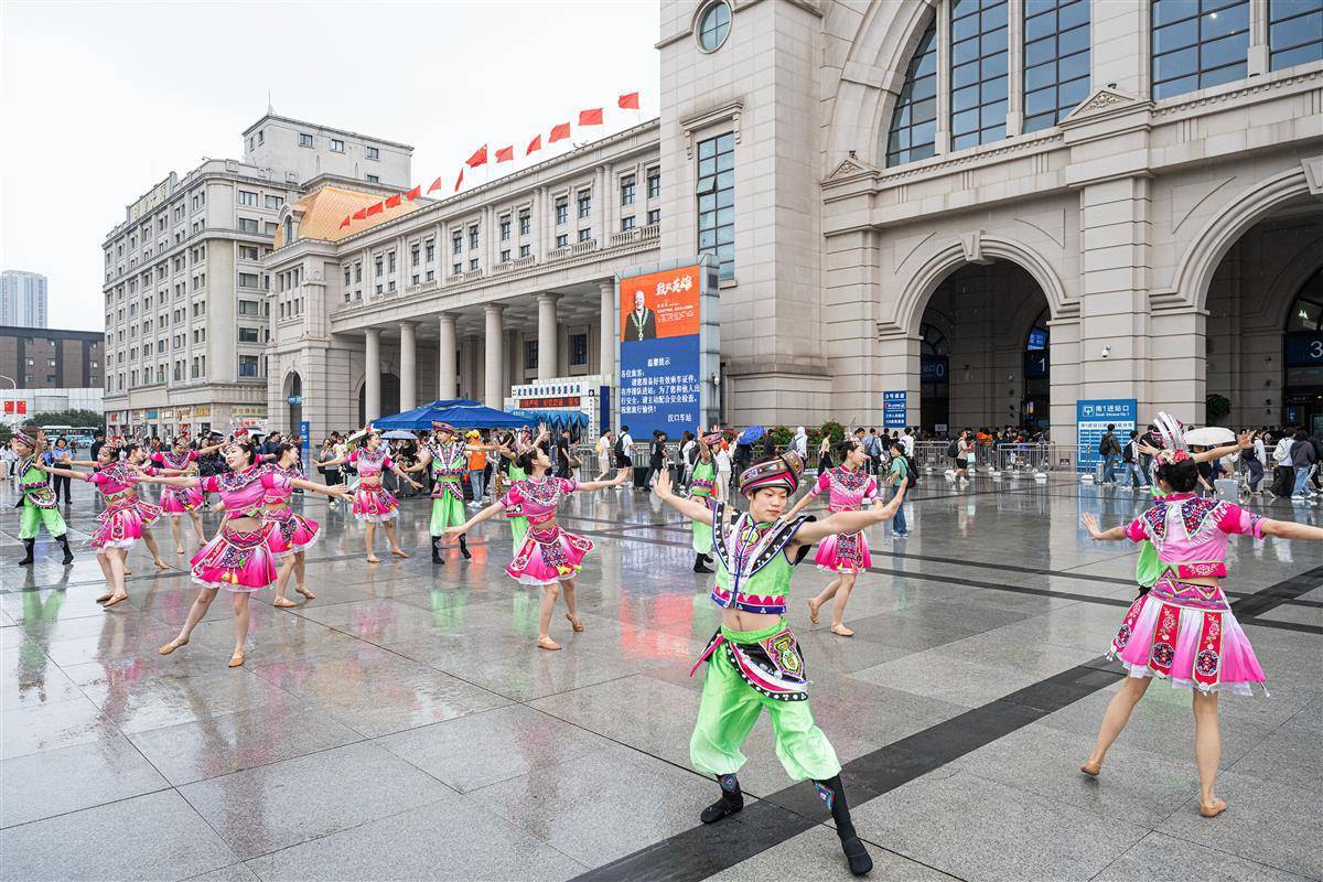 9月30日,在漢口火車站南廣場,來自恩施州來鳳縣的20名土家族舞者快閃表演國家級非遺恩施擺手舞,伴著民族樂曲的節奏,舞者們演繹了“單擺”“雙擺”“回旋擺”等經典動作,展現土家族文化的獨特魅力,為國慶中秋假期出行的旅客營造了濃厚的節日氛圍,現場不少匆匆趕路的旅客停下腳步拍照記錄。
