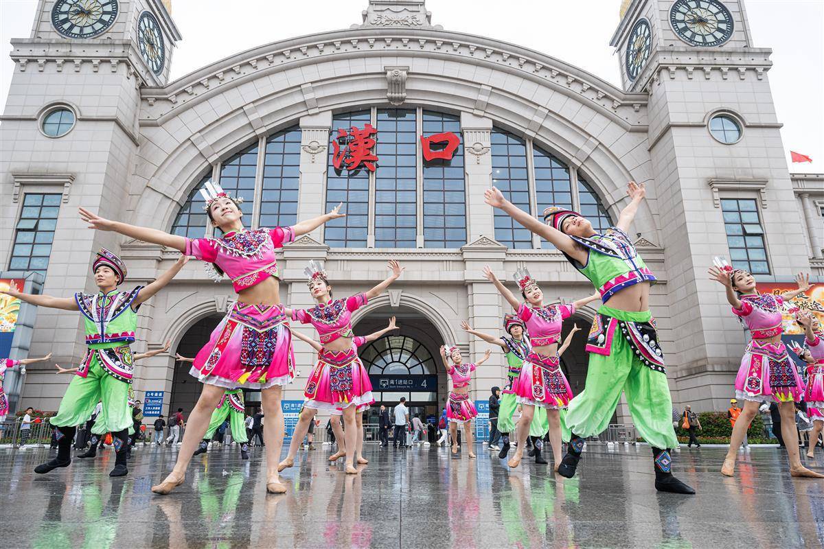 在漢口火車站南廣場,來自恩施州來鳳縣的土家族舞者快閃表演國家級非遺恩施擺手舞。