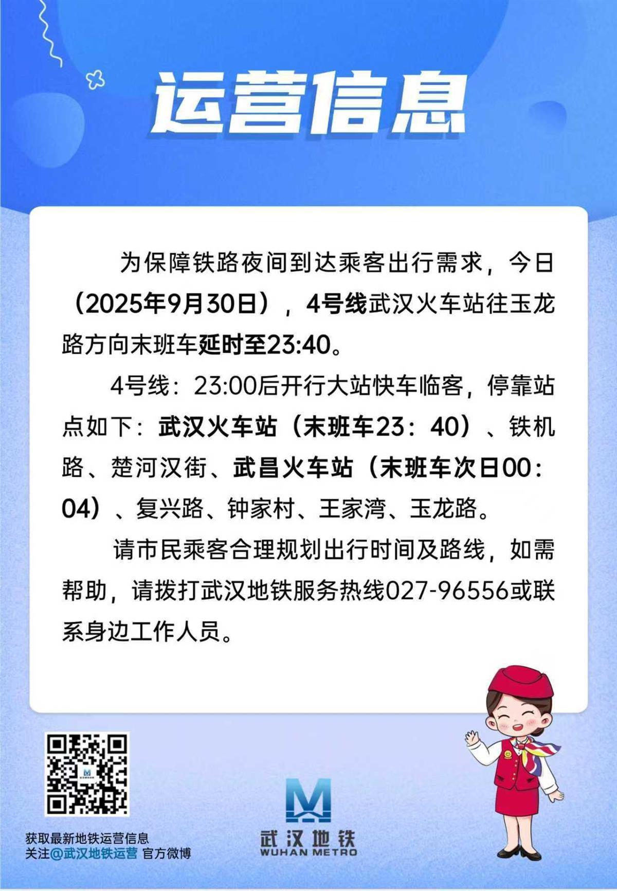 為保障鐵路夜間到達乘客出行需求,今日(9月30日),地鐵4號線武漢火車站往玉龍路方向末班車延時至23:40。