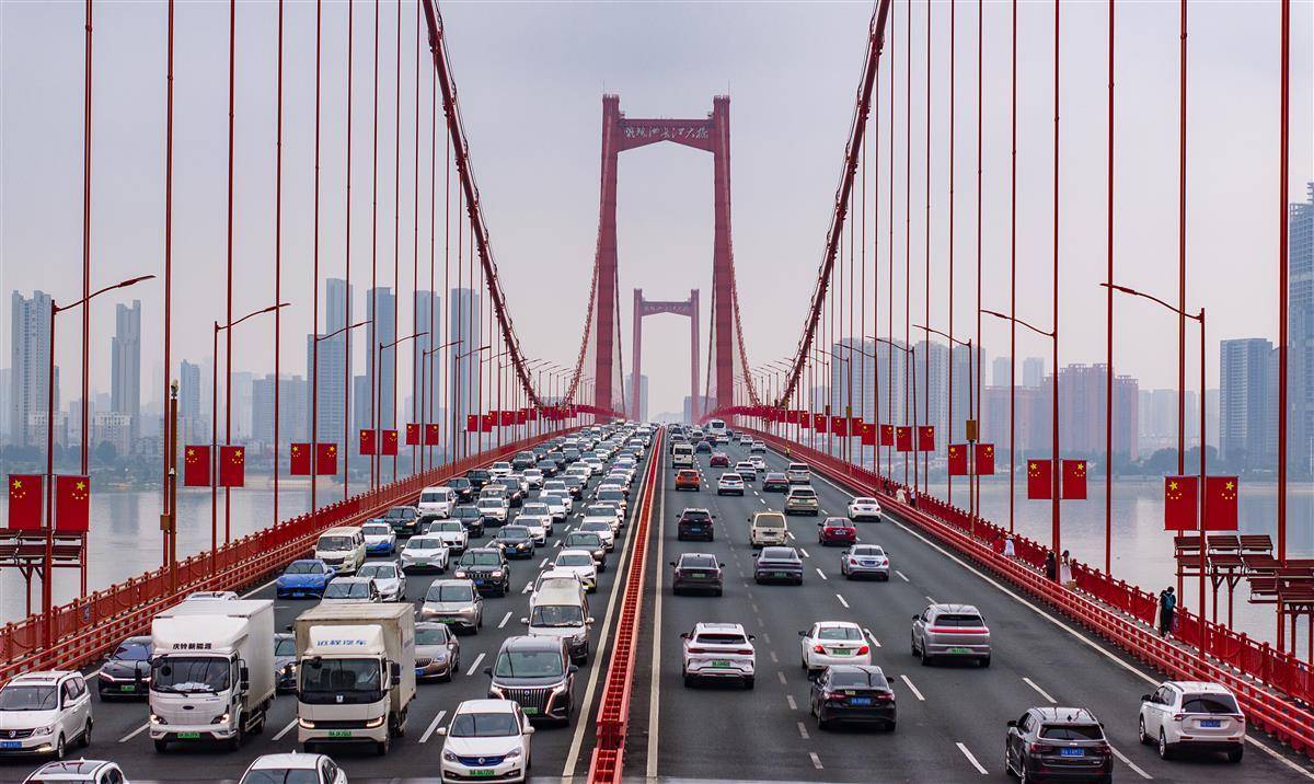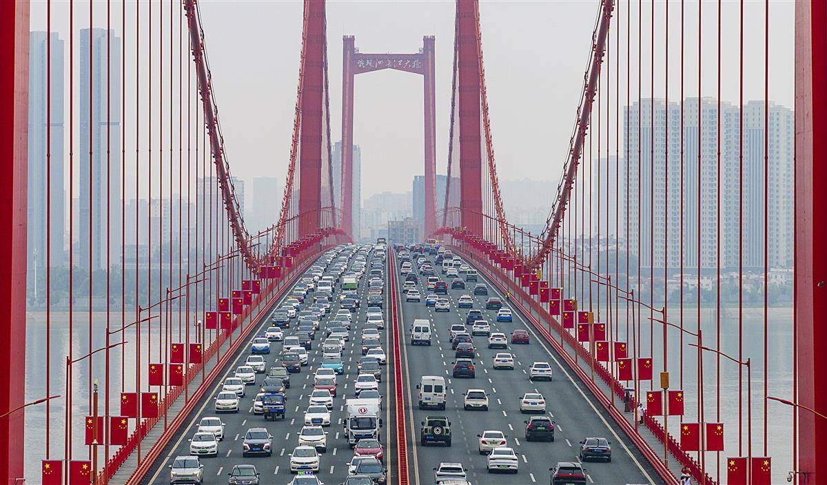 9月30日下午,武漢城區公路車流量迎來激增,鸚鵡洲長江大橋雙向車道迎來大交通流,但交通井然有序。(湖北日報全媒記者 朱熙勇 攝)