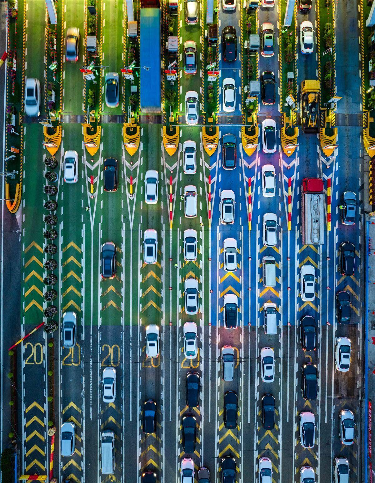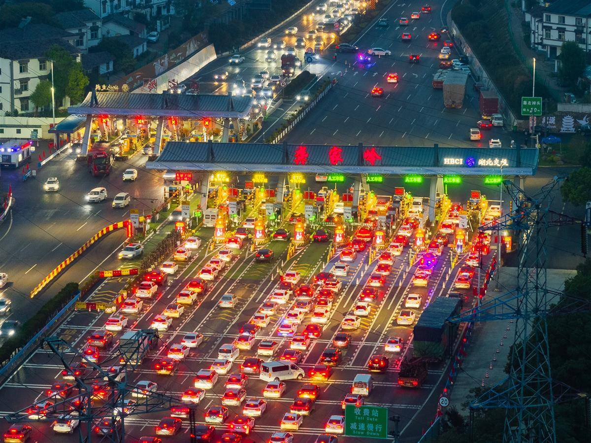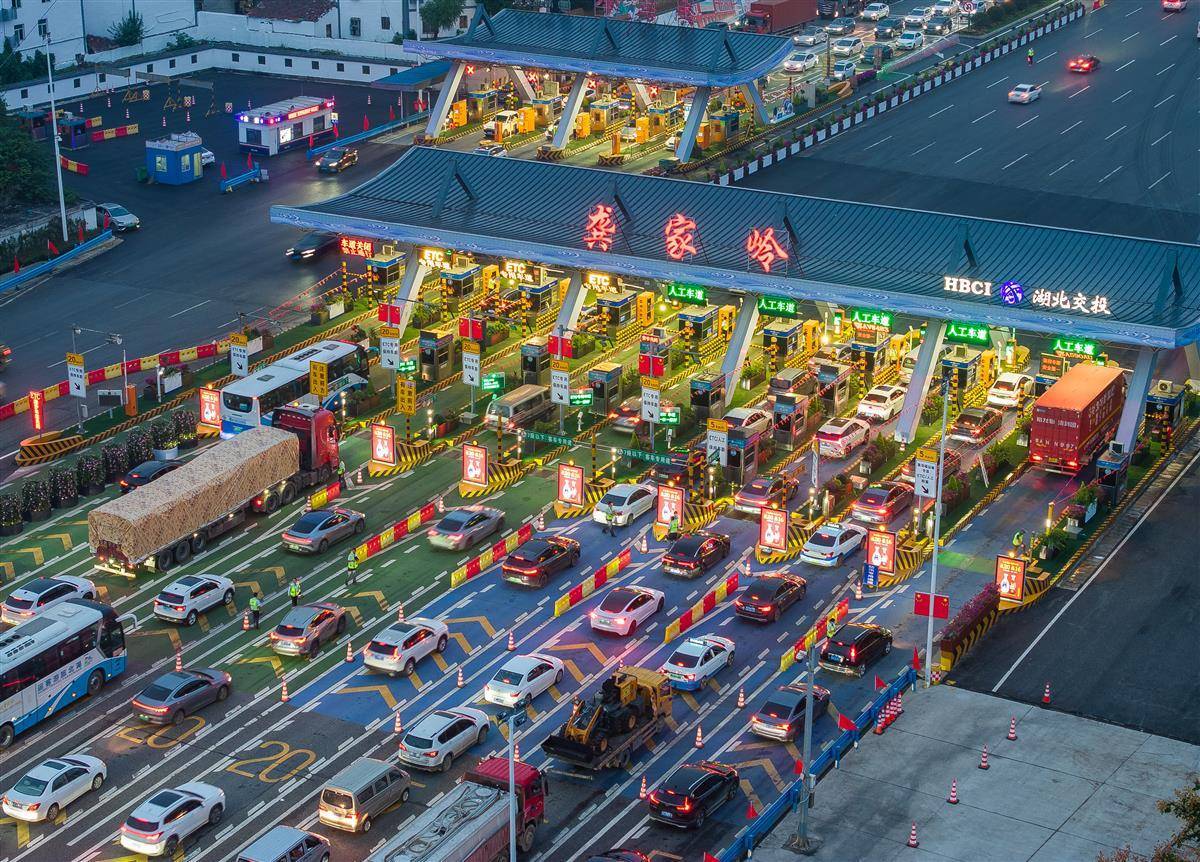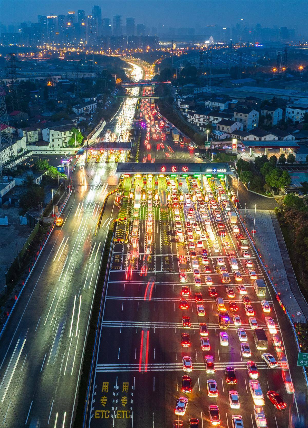 9月30日傍晚,武鄂高速公路武漢龔家嶺收費站,出行和抵達的車流匯聚于此,從高空俯瞰宛如長龍。當天,中秋國慶長假正式開啟,武漢市進出城通道、火車站周邊、熱門景區及大型活動場館周邊的道路交通壓力顯著增大。(湖北日報全媒記者 柯皓 攝)