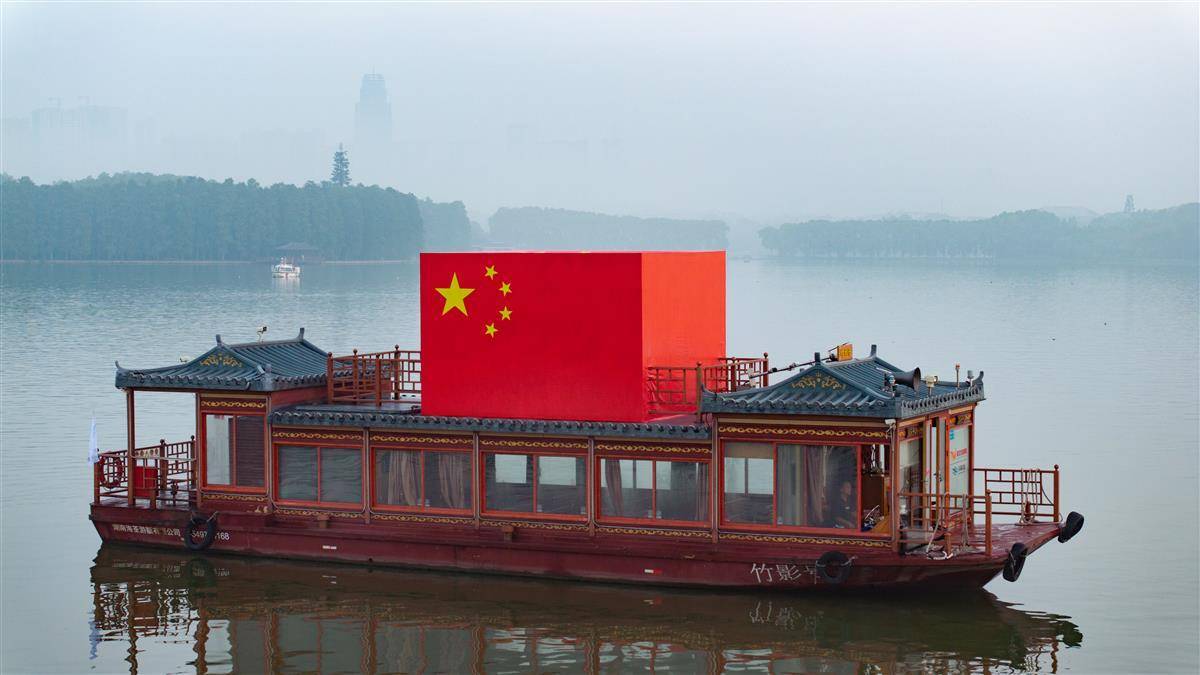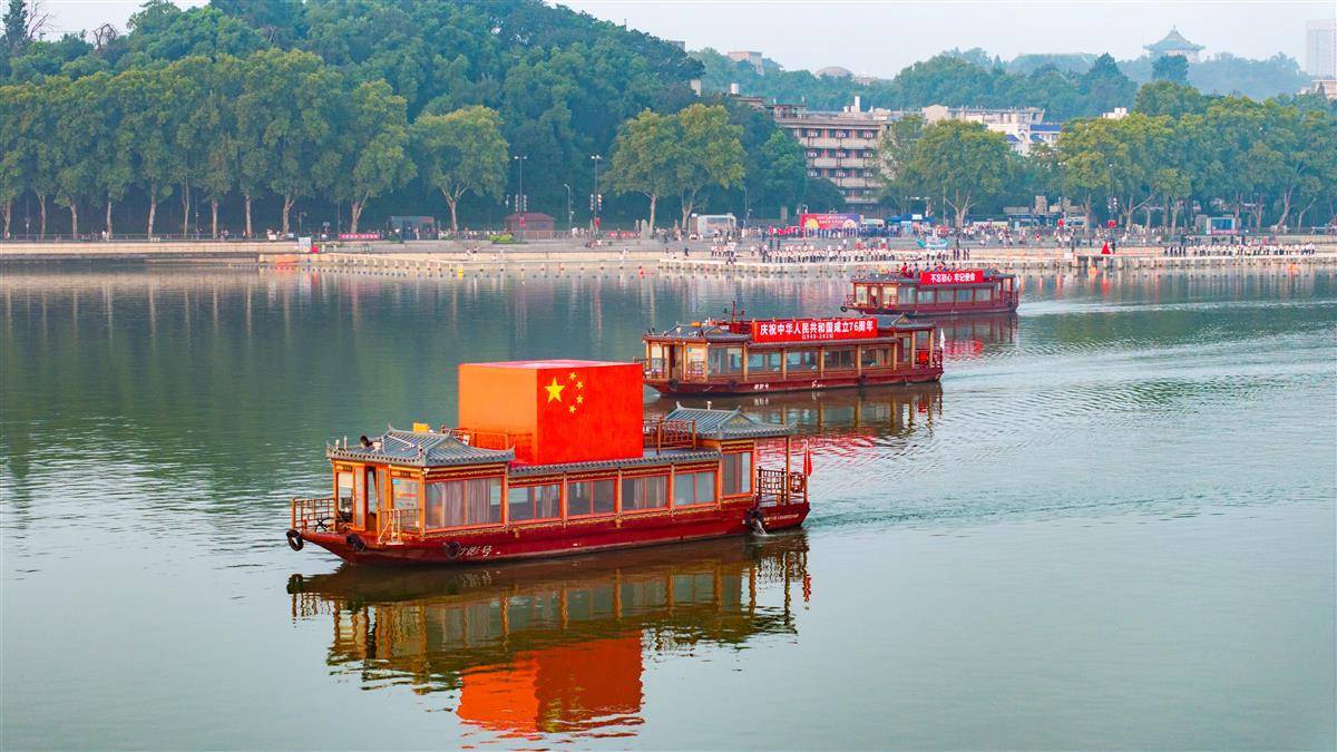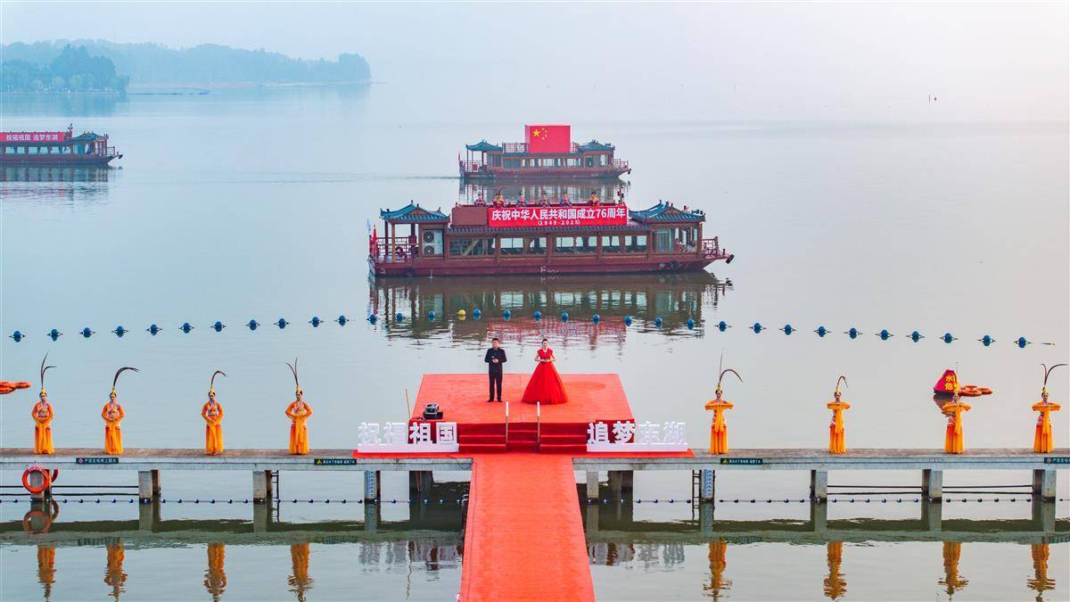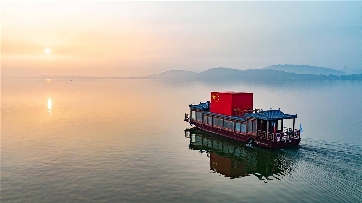 2025年10月1日清晨,武漢東湖凌波門“千帆競發”,以一艘載著巨幅國旗的游船為首,由十余艘帆船、游船、智能船組成的船隊齊齊駛向曙光,上演了一場震撼的“千帆競發”水上盛宴,百余名青年學子和市民游客一起在粼粼波光和初升朝陽中合唱國歌,迎接祖國母親的生日。(湖北日報全媒記者 何宇欣 通訊員 高夢雅 攝)