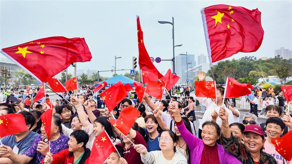 光谷花車巡游現(xiàn)場(chǎng)國(guó)旗招展。(湖北日?qǐng)?bào)全媒記者何宇欣 攝)