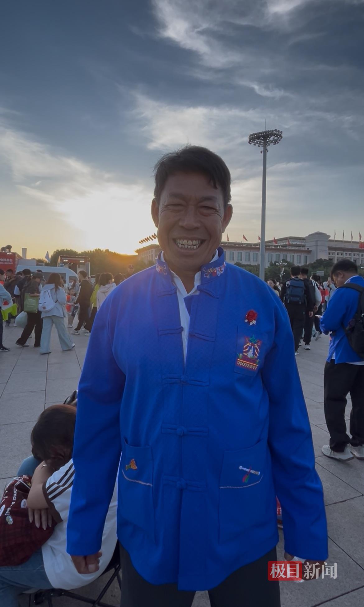 “我們是來自云南的阿昌族,現在穿的藍色上衣是我們阿昌族在節日慶典時才會穿的少數民族服飾,也是特意穿上的。”景四發介紹道,他今年68歲,此次在侄女的陪伴下,與兄弟、弟媳等一行8人來到北京。這是他第一次來到北京,為了趕上國慶的升旗儀式,他們提前幾天就到了。