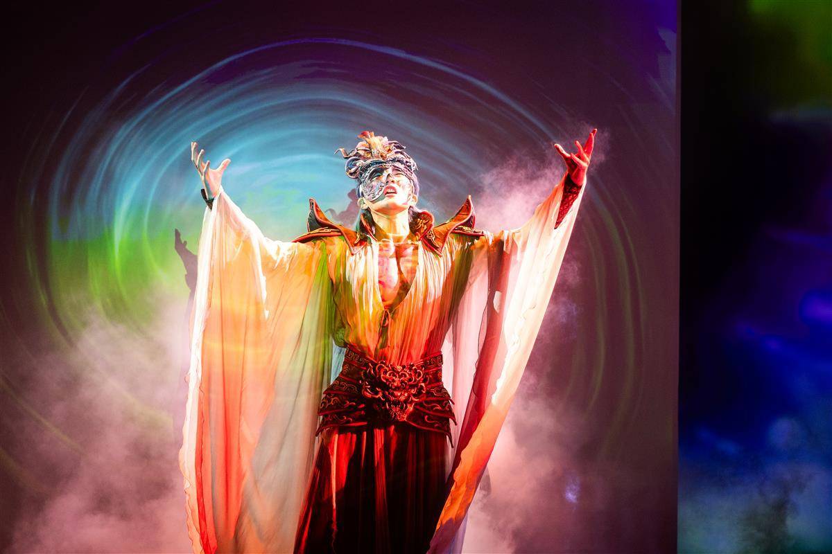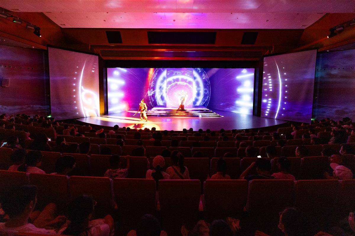 2025年10月1日,“十一”小長假首日,湖北省博物館上新的沉浸式真人全息舞臺劇《遇見·勾踐劍》吸引大批市民游客前來觀看,場場爆滿,座無虛席。該劇把宏大絢麗的沉浸式全息影像與真人表演深度融合,使數字科技與歷史脈絡交相輝映。在30分鐘的演出中,文物不再是靜置于展柜中的器物,而是“活”起來、可與觀眾握手對話的“老朋友”。(湖北日報全媒記者 何宇欣 攝)