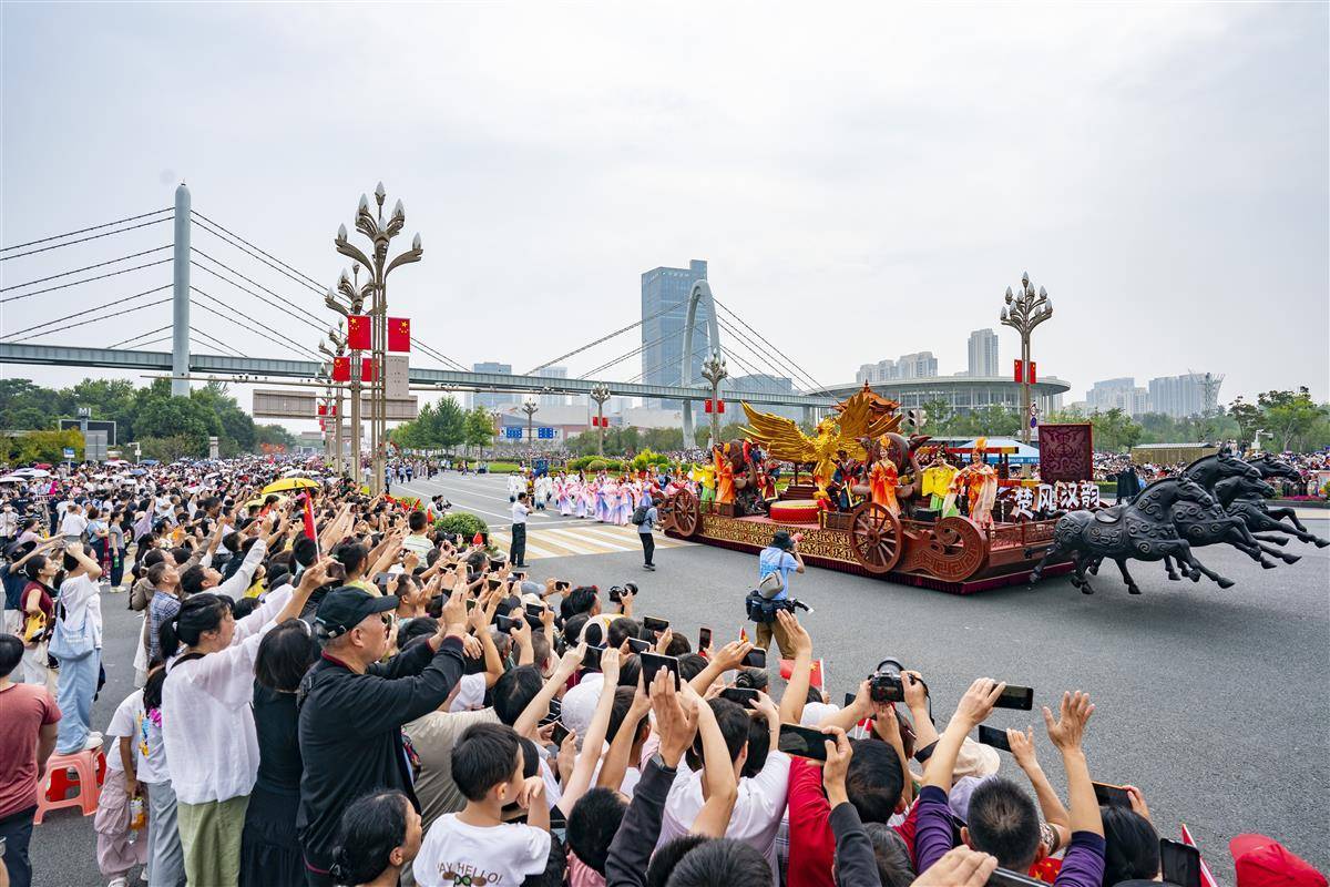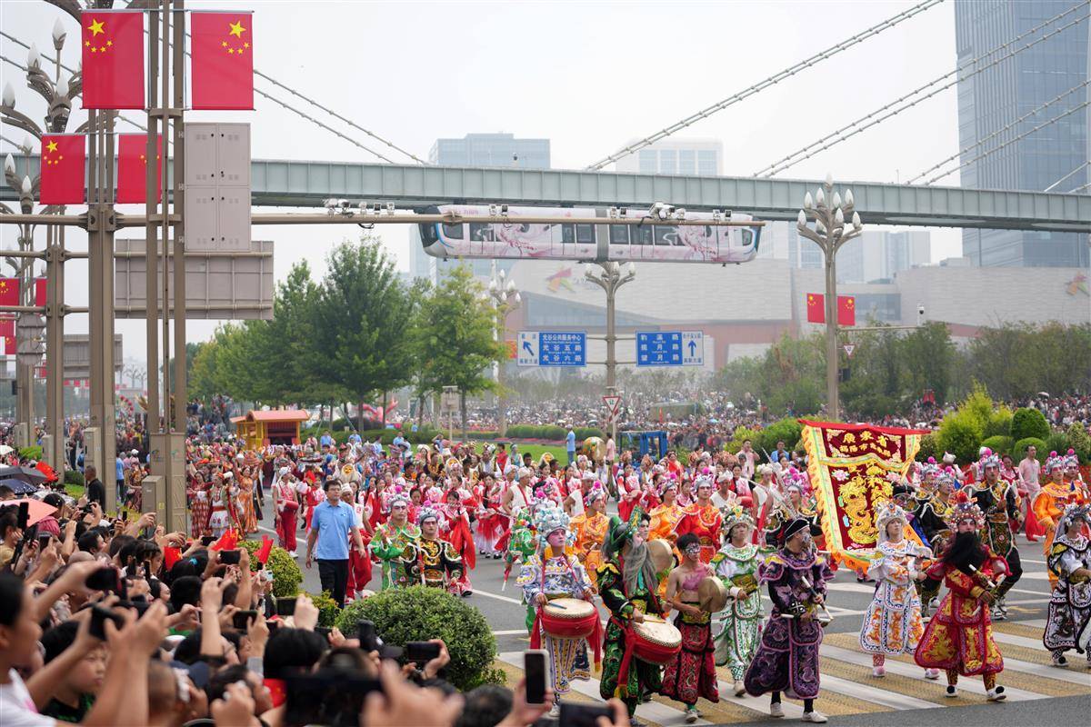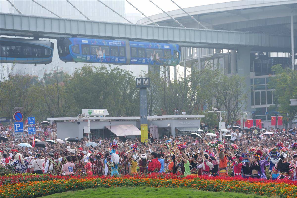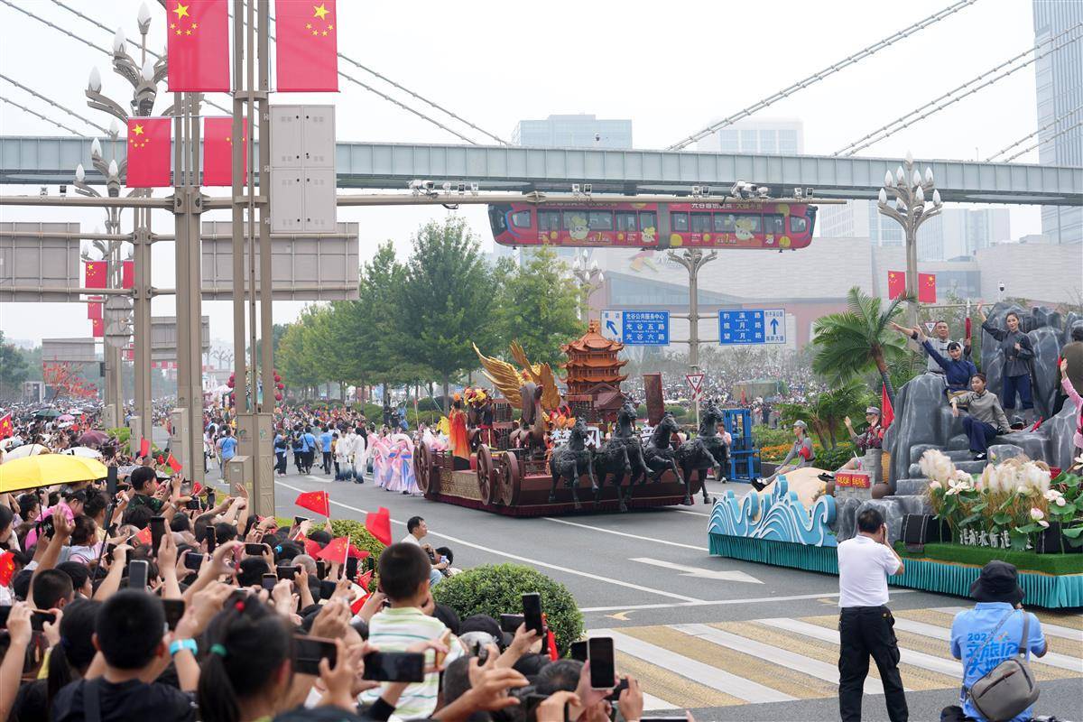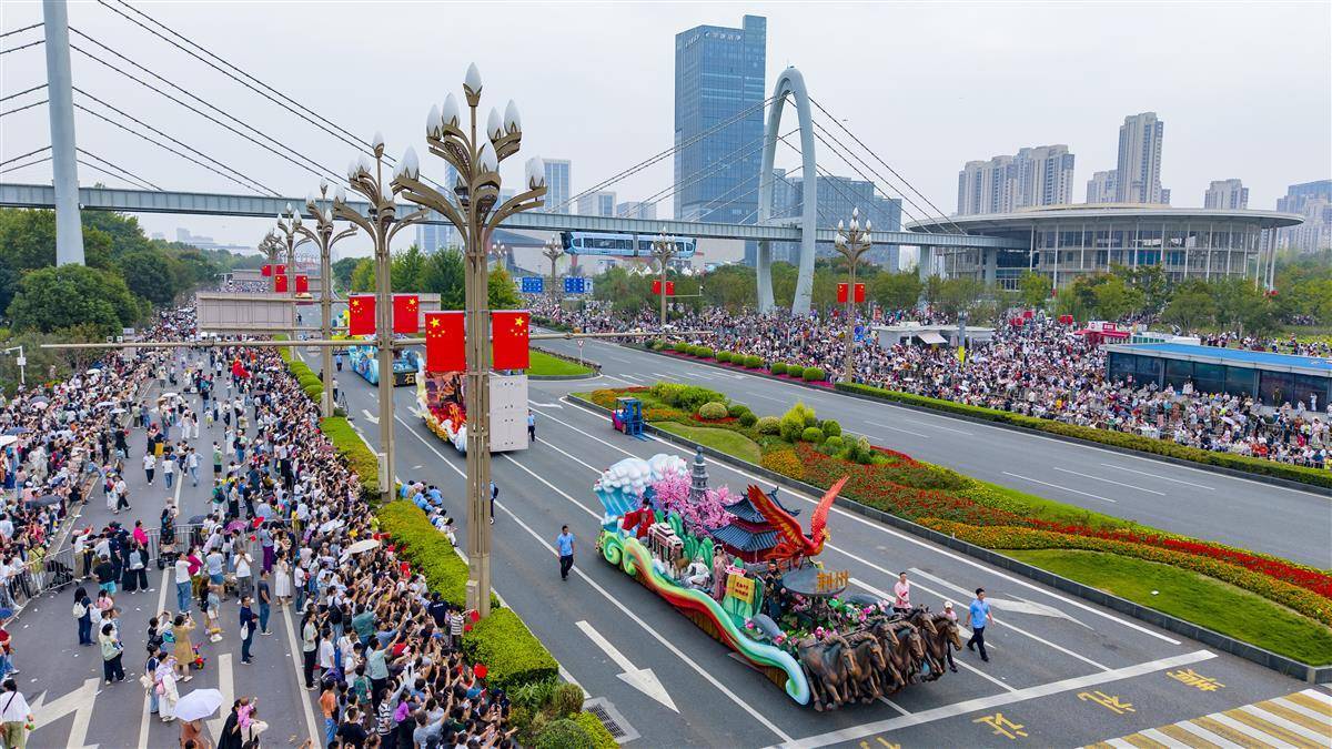 10月1日,武漢光谷高新大道,“河山添錦繡”文旅IP城市大巡游與科幻的光谷空軌同框。“河山錦繡”“初心如磐”“楚風漢韻”“非遺國潮”“動漫萌寵”“全球狂歡”等23臺主題花車讓市民、游客大飽眼福。廣東英歌舞、西藏山南藏戲、福建泉州“簪花圍”、四川變臉等38組特色文旅表演團隊輪番登場表演、與觀眾互動。(湖北日報全媒記者 魏錸 攝)