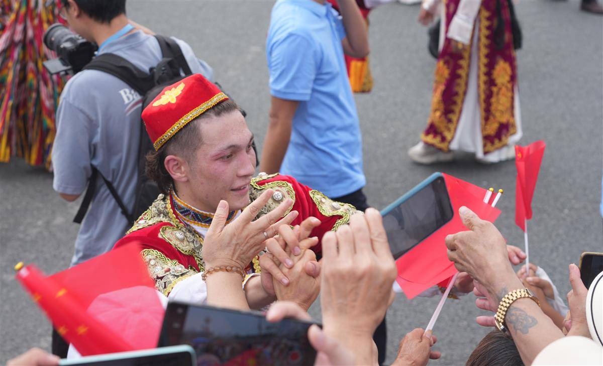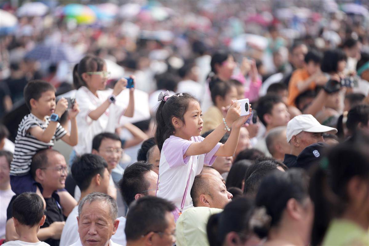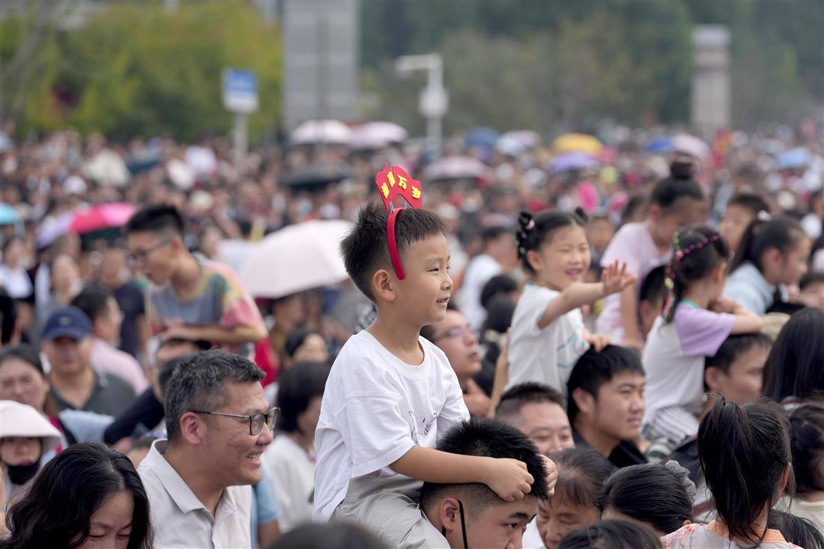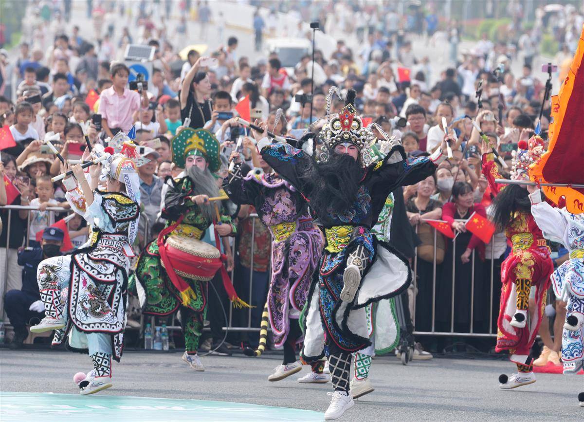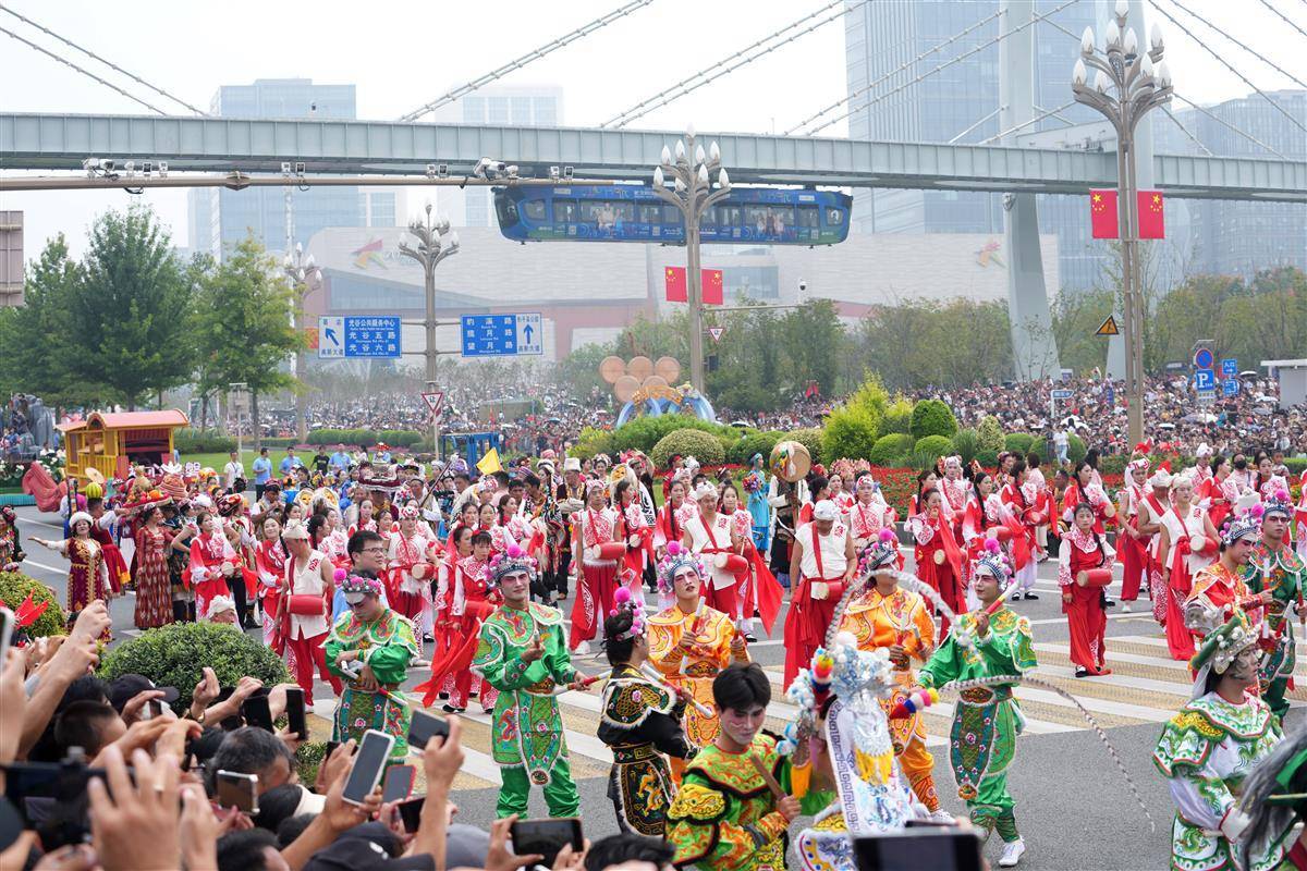 10月1日,武漢光谷高新大道,“河山添錦繡”文旅IP城市大巡游與科幻的光谷空軌同框。“河山錦繡”“初心如磐”“楚風漢韻”“非遺國潮”“動漫萌寵”“全球狂歡”等23臺主題花車讓市民、游客大飽眼福。廣東英歌舞、西藏山南藏戲、福建泉州“簪花圍”、四川變臉等38組特色文旅表演團隊輪番登場表演、與觀眾互動。(湖北日報全媒記者 魏錸 攝)