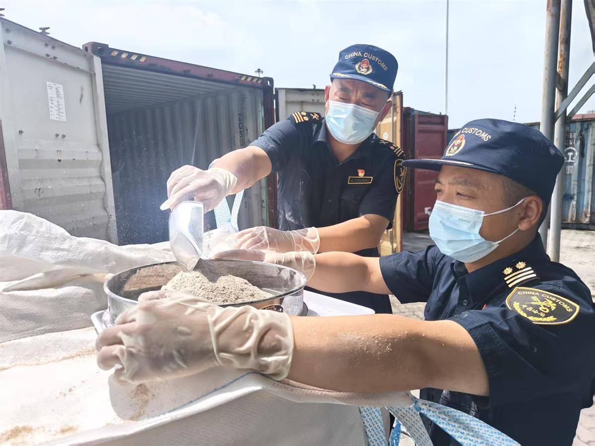 關員董偉、王非正在對中亞進口飼用小麥粉開展查驗。陳寬衛攝
