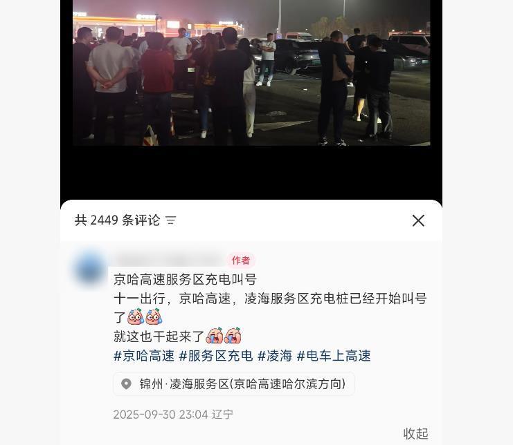十一前夕,9月30日晚,多位車主稱,京哈高速凌海服務(wù)區(qū)電車充電,已經(jīng)開始“排隊叫號”了。10月1日,一名電車車主告訴極目新聞記者,30日晚,凌海服務(wù)區(qū)有人拿著大喇叭在充電樁處喊號,自己排了半個多小時才充上了電。